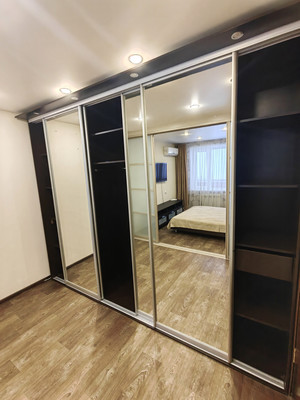 Мебель на фото: кухонный гарнитур, кровать, тумбы, вместительный зеркальный шкаф купе