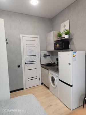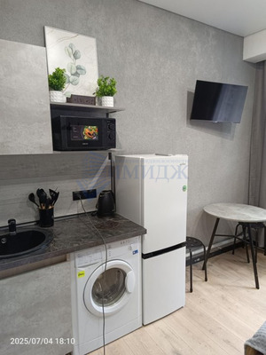 Имеется стиральная машина, диван, телевизор, микроволновая печь, плита, кухонный гарнитур.