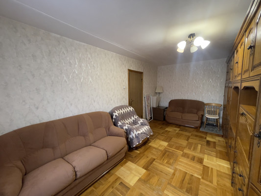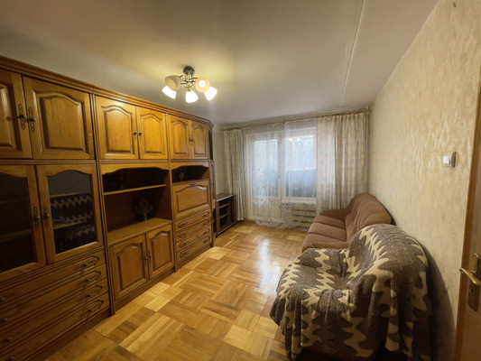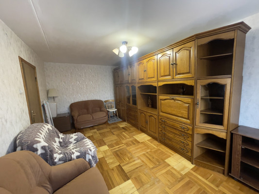 Квартира в аккуратном жилом состоянии — чистая, ухоженная, можно заехать и жить без дополнительных вложений. В комнате натуральный паркет в хорошем состоянии, стены аккуратные. Установлена добротная классическая мебель из натурального дерева, которая отлично сохранилась и создаёт приятную домашнюю атмосферу.