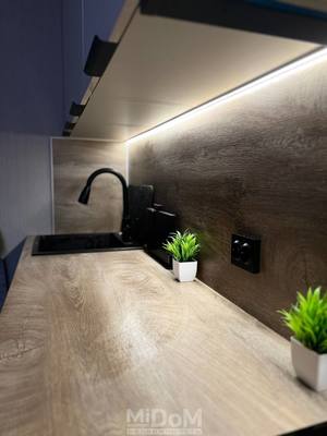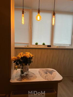 Из кухни сделан выход на утеплённый балкон, подоконник с оборудован, как рабочий стол, над ним сделано уютное освещение. На балконе стоят кресло-кровать и туалетный столик, положен тёплый пол.