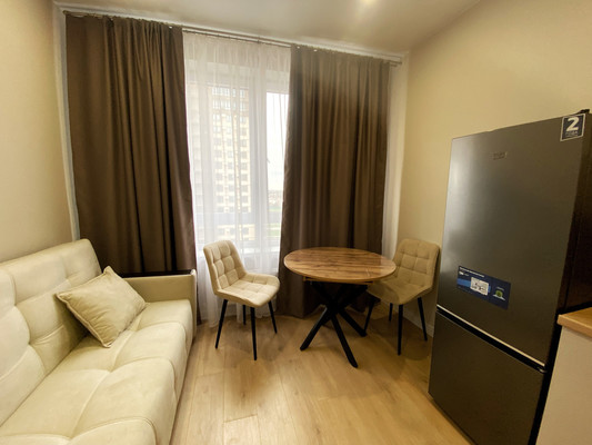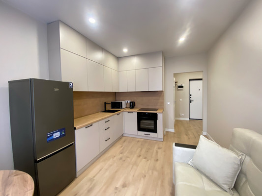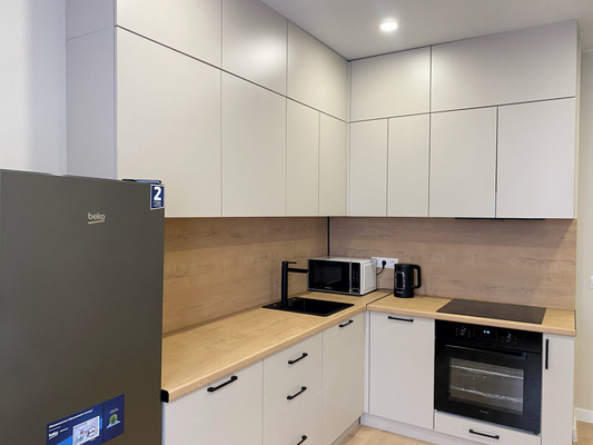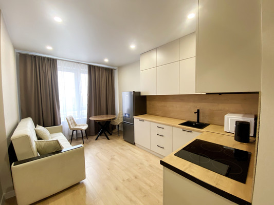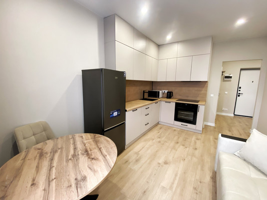 Кухня-гостиная с современной техникой и большим столом. Изолированная спальня Гардеробная + просторный коридор Вся мебель и техника — новые.