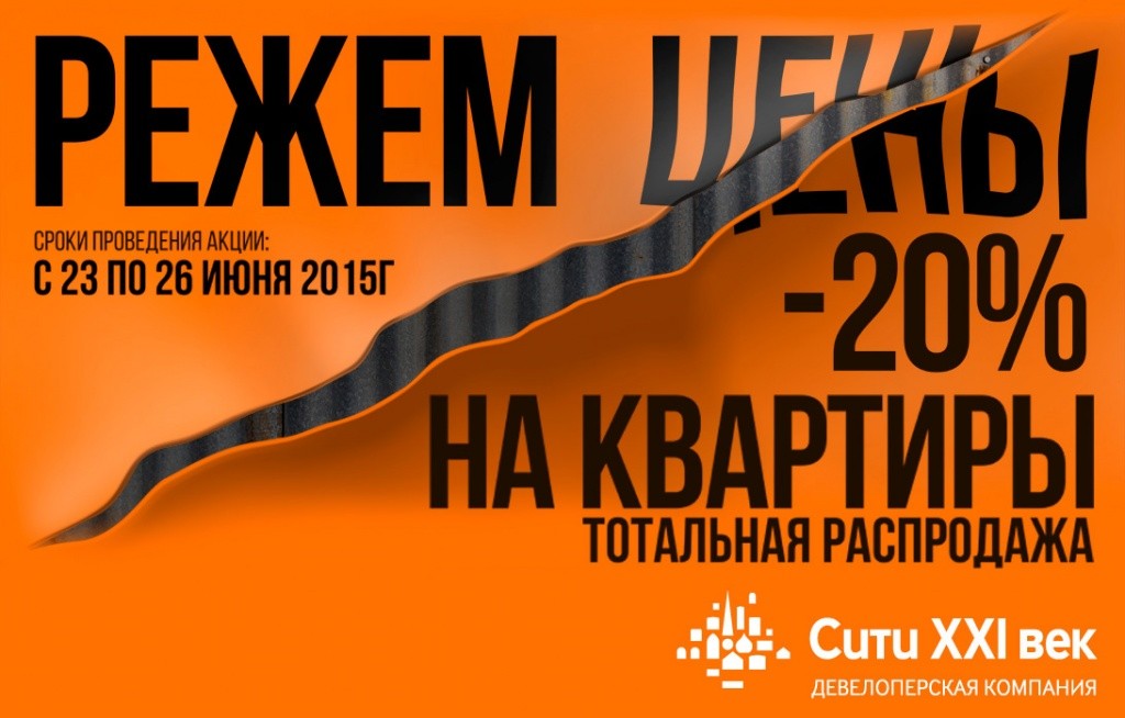 Всего четыре волшебных дня! С 23 по 26 июня «Сити-XXI век» проводит акцию по распродаже квартир. С выгодой до 20% их можно приобрести в московских и подмосковных жилых комплексах*. Условие акции - 100%-ая оплата в течение 3-х банковских дней. К услугам клиентов – широкий выбор ипотечных программ.