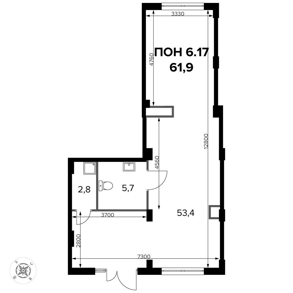 - Общая площадь 61.9 м²