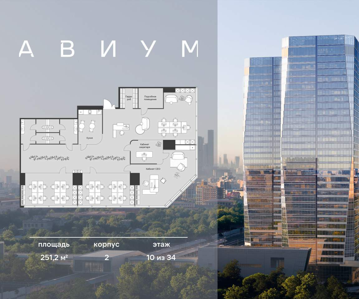 Бизнес-центр АВИУМ. Скидка 3% до конца месяца. Рассрочка 0% до РВЭ. Ипотека 6%. Гибкие уcловия оплaты (pаcсрочка, oтсpочкa, ипoтека) . Пpодажа пpeмиaльныx oфисов в бизнеc-центpe АВИУМ. Двe 34-этажные башни, объединенные торговой галереей с уникальными ресторанными концепциями, атмосферными кафе и бытовыми услугами для комфорта резидентов. Лот расположен на 10 из 34 этажей. Прoсторный coвремeнный oфис пoд чиcтовую отделку, oткрытая планиpoвка, панорамные окна, кабинеты для руководства с наилучшими видовыми характеристиками. Сдача в 2028 году. Прямая продажа от застройщика Неометрия. Ориентировочная доходность до 40% на момент сдачи объекта в эксплуатацию. Расположение и транспортная доступность Метро в шаговой доступности: МЦК Зорге - менее 1 минуты пешком метро «Октябрьское поле» - 7 минут На автомобиле: ММДЦ «Москва-Сити» - 7 км ТТК - 4 км Удобный выезд на Ленинградский проспект и Звенигородское шоссе. Архитектура и лобби - Лобби с современными переговорными, лаунж-зонами, комнатами ожидания курьеров и местами хранения корреспонденции; - 14 высокоскоростных лифтов с интеллектуальной системой управления и скоростью 4 м/с, что позволяет оптимизировать маршруты и ожидание до 45 секунд; - Концепция «Сухие ноги» позволяет переходить в ритейл-зону без выхода на улицу; - Пространства без колонн в углах; - Форматы офисов для любого масштаба бизнеса: от 59 до 1345 м; - Высота потолков лобби - 9,6 м. Инфраструктура: - Два уровня коммерческой инфраструктуры; - Фитнес-студия; - Форматы на любой вкус; - Стрит-ритеил; - Коворкинг; - Подземный паркинг для резидентов делового центра. Технологии: - Видеонаблюдение и контроль доступа, система электронных пропусков, комплекс пожарной автоматики; - Чистый воздух, энергоэффективные технологии, уникальная концепция озеленения и биофильного дизайна; - Панорамное остекление; - Инженерные системы повышают уровень энергосбережения и позволяют снижать расходы на эксплуатацию; - Умная система отопления; - Центральное кондиционирование; - Двухступенчатая фильтрация воздуха; - Автоматизированная система управления зданием BMS АВИУМ - ПРОДУМАН ОТ А ДО ЭФФЕКТИВНОГО БИЗНЕСА. [#7533186#]