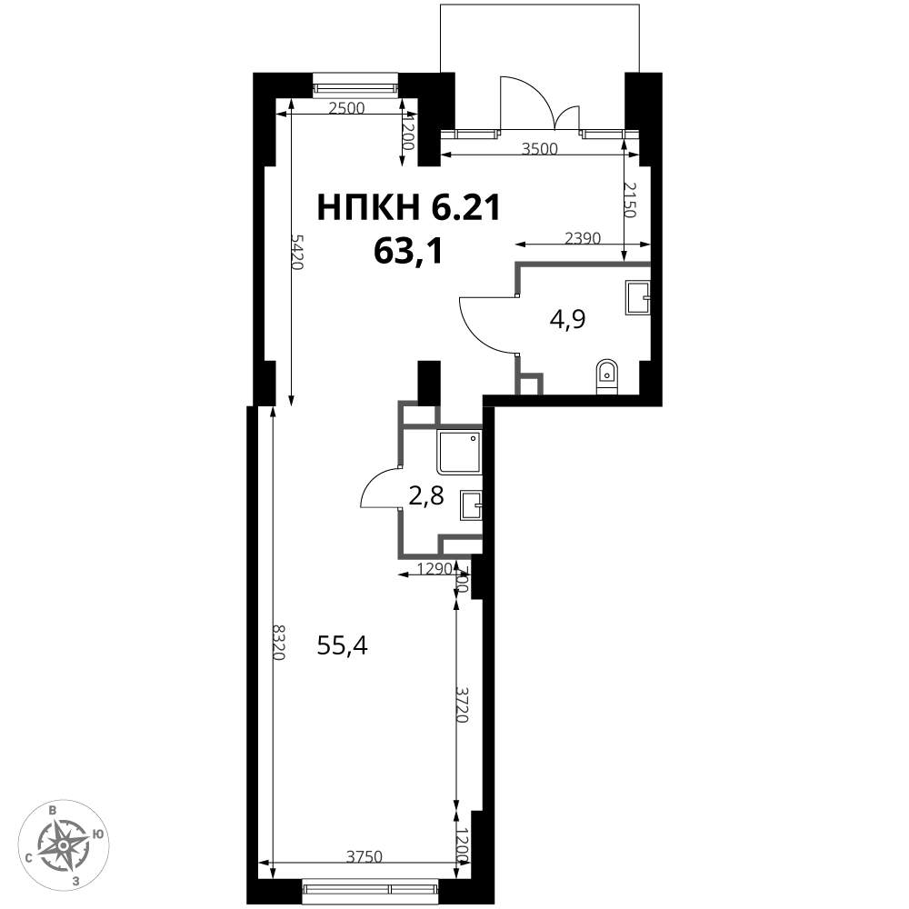 - Общая площадь 63.1 м²