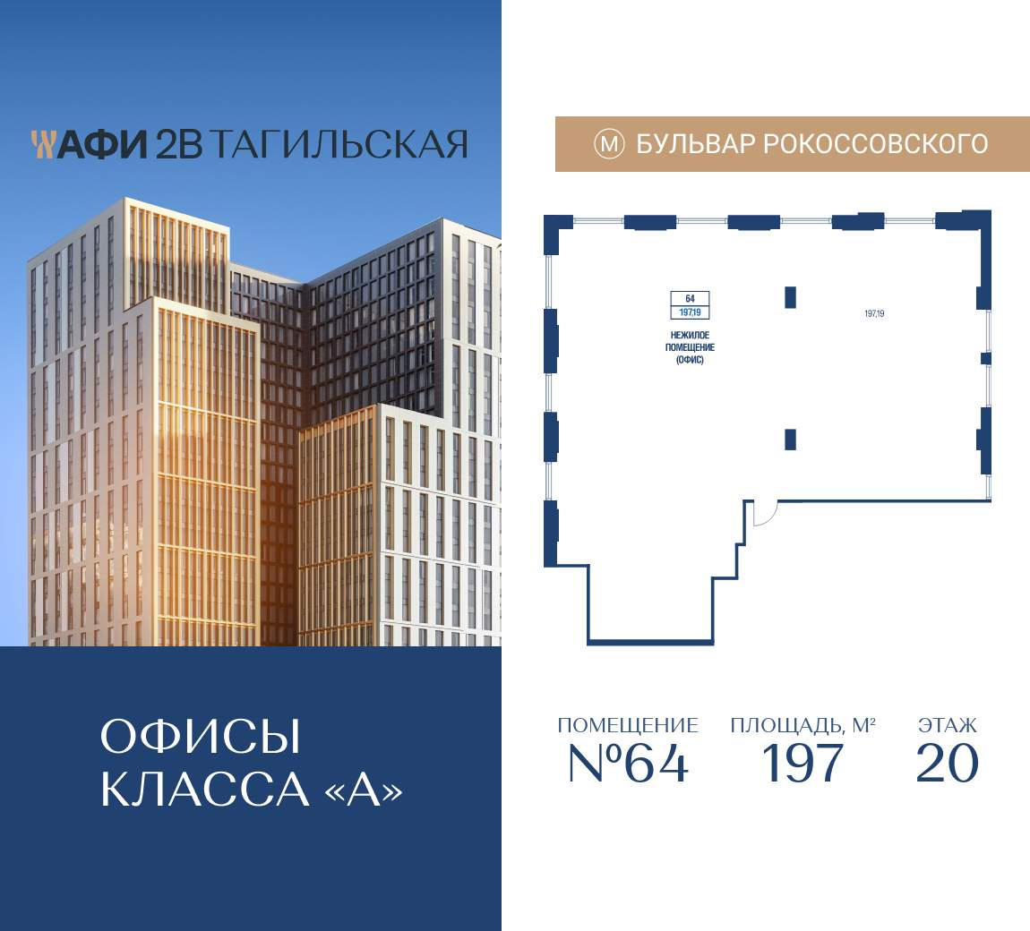 Продается коммерческое помещение общей площадью 197 м2 на 20 этаже в строящемся бизнес-центре АФИ2В Тагильская. 26-этажный бизнес-центр АФИ2В Тагильская от девелопера с мировым именем AFI Development - это инновационный комплекс, задающий новый стандарт деловых пространств на востоке Москвы. Проект объединяет статусные офисы, ресторанный дворик, супермаркет и озеленённую террасу, создавая полноценную экосистему для бизнеса. На первых этажах расположатся торговая галерея, ресторанный дворик и просторное лобби. Подземный паркинг на 200 машино-мест создаст удобную логистику для резидентов и гостей комплекса. Эргономичные openspace-планировки дадут возможность организовать на каждом этаже функциональные рабочие зоны, переговорные комнаты, кабинеты руководителей, конференц-зал, бизнес-гостиные и зоны отдыха. За счет неглубокой посадки офисов и панорамного остекления все помещения хорошо освещаются естественным образом. Современные инженерные системы (приточно-вытяжная вентиляция, мультизональное кондиционирование) и централизованная система управления зданием (BMS) гарантируют комфортный микроклимат и энергоэффективность. Круглосуточная охрана, видеонаблюдение и консьерж-сервис обеспечивают безопасность и высокий уровень сервиса. Стратегическое расположение на Открытом шоссе обеспечивает отличную логистику: всего 6 минут пешком до станции МЦК «Бульвар Рокоссовского» и 9 минут пешком до одноименной станции метро. 15 минут до МКАД и ТТК. Рядом расположены ЖК «Сиреневый парк», «парк Лосиный Остров» и вся необходимая социальная инфраструктура. Ввод в эксплуатацию запланирован на III квартал 2026 года. Действует рассрочка 0% до конца строительства. [#7698685#]