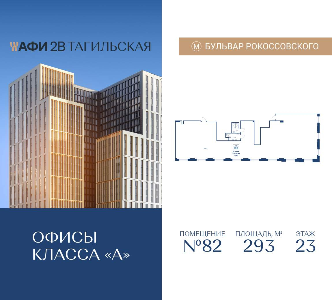 Продается коммерческое помещение общей площадью 293 м2 на 23 этаже в строящемся бизнес-центре АФИ2В Тагильская. 26-этажный бизнес-центр АФИ2В Тагильская от девелопера с мировым именем AFI Development - это инновационный комплекс, задающий новый стандарт деловых пространств на востоке Москвы. Проект объединяет статусные офисы, ресторанный дворик, супермаркет и озеленённую террасу, создавая полноценную экосистему для бизнеса. На первых этажах расположатся торговая галерея, ресторанный дворик и просторное лобби. Подземный паркинг на 200 машино-мест создаст удобную логистику для резидентов и гостей комплекса. Эргономичные openspace-планировки дадут возможность организовать на каждом этаже функциональные рабочие зоны, переговорные комнаты, кабинеты руководителей, конференц-зал, бизнес-гостиные и зоны отдыха. За счет неглубокой посадки офисов и панорамного остекления все помещения хорошо освещаются естественным образом. Современные инженерные системы (приточно-вытяжная вентиляция, мультизональное кондиционирование) и централизованная система управления зданием (BMS) гарантируют комфортный микроклимат и энергоэффективность. Круглосуточная охрана, видеонаблюдение и консьерж-сервис обеспечивают безопасность и высокий уровень сервиса. Стратегическое расположение на Открытом шоссе обеспечивает отличную логистику: всего 6 минут пешком до станции МЦК «Бульвар Рокоссовского» и 9 минут пешком до одноименной станции метро. 15 минут до МКАД и ТТК. Рядом расположены ЖК «Сиреневый парк», «парк Лосиный Остров» и вся необходимая социальная инфраструктура. Ввод в эксплуатацию запланирован на III квартал 2026 года. Действует рассрочка 0% до конца строительства. [#7698709#]