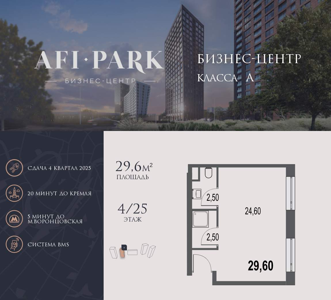 Продается просторное коммерческое помещение общей площадью 29,6 м2 на 4 этаже в строящемся бизнес-центре AFI Park. 21-этажный бизнес-центр AFI Park - современный бизнес-центр класса A с мультифункциональной экосистемой для бизнеса, панорамным остеклением и эргономичным пространством станет завершающим этапом клубного квартала. На первом этаже здания - лобби с комфортной зоной ожидания, кофе-поинтами и банкоматами, ресторан и торговая зона. Со второго этажа располагаются офисные помещения, формат которых предусматривает «нарезку» по желанию арендатора. Эргономичные openspace-планировки дают возможность организовать на каждом этаже функциональные рабочие зоны, переговорные комнаты, кабинеты руководителей, конференц-зал, бизнес-гостиные и зоны отдыха. За счет неглубокой посадки офисов и панорамного остекления все помещения хорошо освещаются естественным образом. Из окон открывается панорамный вид на город и Воронцовский парк, а высокие потолки и остекление «в пол» наполняют офисное пространство дополнительным воздухом и светом. Инфраструктура бизнес-центра создана с учетом ежедневных потребностей офисных резидентов. У входа расположена зона для посадки в такси и 11 гостевых машино-мест. В подземной части находится паркинг на 44 машино-места. На первом этаже - лобби с комфортной зоной ожидания, кофе-поинтами и банкоматами, ресторан и торговое пространство с сервисами быта. Здание оснащено централизованной системой автоматизации и управления, гарантирующей высокие стандарты контроля доступа и уровень комфорта. Принудительная приточно-вытяжная система вентиляции с подогревом и рециркуляцией воздуха, мультизональная система кондиционирования VRV, система освещения, пожарной сигнализации, управления высокоскоростными пассажирскими и грузовыми лифтами BLT, все контролируется диспетчером в автоматическом режиме через Building Management System, исключая человеческий фактор и неожиданные сбои. Круглосуточная охрана и видеонаблюдение внутри и по периметру здания позволяют эксплуатирующей компании в любое время заботиться о бизнес-центре, его резидентах и гостях, а консьерж-сервис окажет необходимые услуги по запросу резидентов в пределах здания. Стратегическое расположение между Ленинским проспектом и улицей Профсоюзной, на пересечении Старокалужского шоссе с улицей Академика Челомея обеспечивает удобную логистику на наземном транспорте, а пешая доступность станции метро БКЛ «Воронцовская» подключает локацию практически к любому району Москвы. [#7698846#]