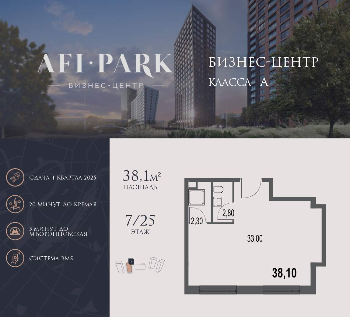 Продается просторное коммерческое помещение общей площадью 38,1 м2 на 7 этаже в строящемся бизнес-центре AFI Park. 21-этажный бизнес-центр AFI Park - современный бизнес-центр класса A с мультифункциональной экосистемой для бизнеса, панорамным остеклением и эргономичным пространством станет завершающим этапом клубного квартала. На первом этаже здания - лобби с комфортной зоной ожидания, кофе-поинтами и банкоматами, ресторан и торговая зона. Со второго этажа располагаются офисные помещения, формат которых предусматривает «нарезку» по желанию арендатора. Эргономичные openspace-планировки дают возможность организовать на каждом этаже функциональные рабочие зоны, переговорные комнаты, кабинеты руководителей, конференц-зал, бизнес-гостиные и зоны отдыха. За счет неглубокой посадки офисов и панорамного остекления все помещения хорошо освещаются естественным образом. Из окон открывается панорамный вид на город и Воронцовский парк, а высокие потолки и остекление «в пол» наполняют офисное пространство дополнительным воздухом и светом. Инфраструктура бизнес-центра создана с учетом ежедневных потребностей офисных резидентов. У входа расположена зона для посадки в такси и 11 гостевых машино-мест. В подземной части находится паркинг на 44 машино-места. На первом этаже - лобби с комфортной зоной ожидания, кофе-поинтами и банкоматами, ресторан и торговое пространство с сервисами быта. Здание оснащено централизованной системой автоматизации и управления, гарантирующей высокие стандарты контроля доступа и уровень комфорта. Принудительная приточно-вытяжная система вентиляции с подогревом и рециркуляцией воздуха, мультизональная система кондиционирования VRV, система освещения, пожарной сигнализации, управления высокоскоростными пассажирскими и грузовыми лифтами BLT, все контролируется диспетчером в автоматическом режиме через Building Management System, исключая человеческий фактор и неожиданные сбои. Круглосуточная охрана и видеонаблюдение внутри и по периметру здания позволяют эксплуатирующей компании в любое время заботиться о бизнес-центре, его резидентах и гостях, а консьерж-сервис окажет необходимые услуги по запросу резидентов в пределах здания. Стратегическое расположение между Ленинским проспектом и улицей Профсоюзной, на пересечении Старокалужского шоссе с улицей Академика Челомея обеспечивает удобную логистику на наземном транспорте, а пешая доступность станции метро БКЛ «Воронцовская» подключает локацию практически к любому району Москвы. [#7698860#]