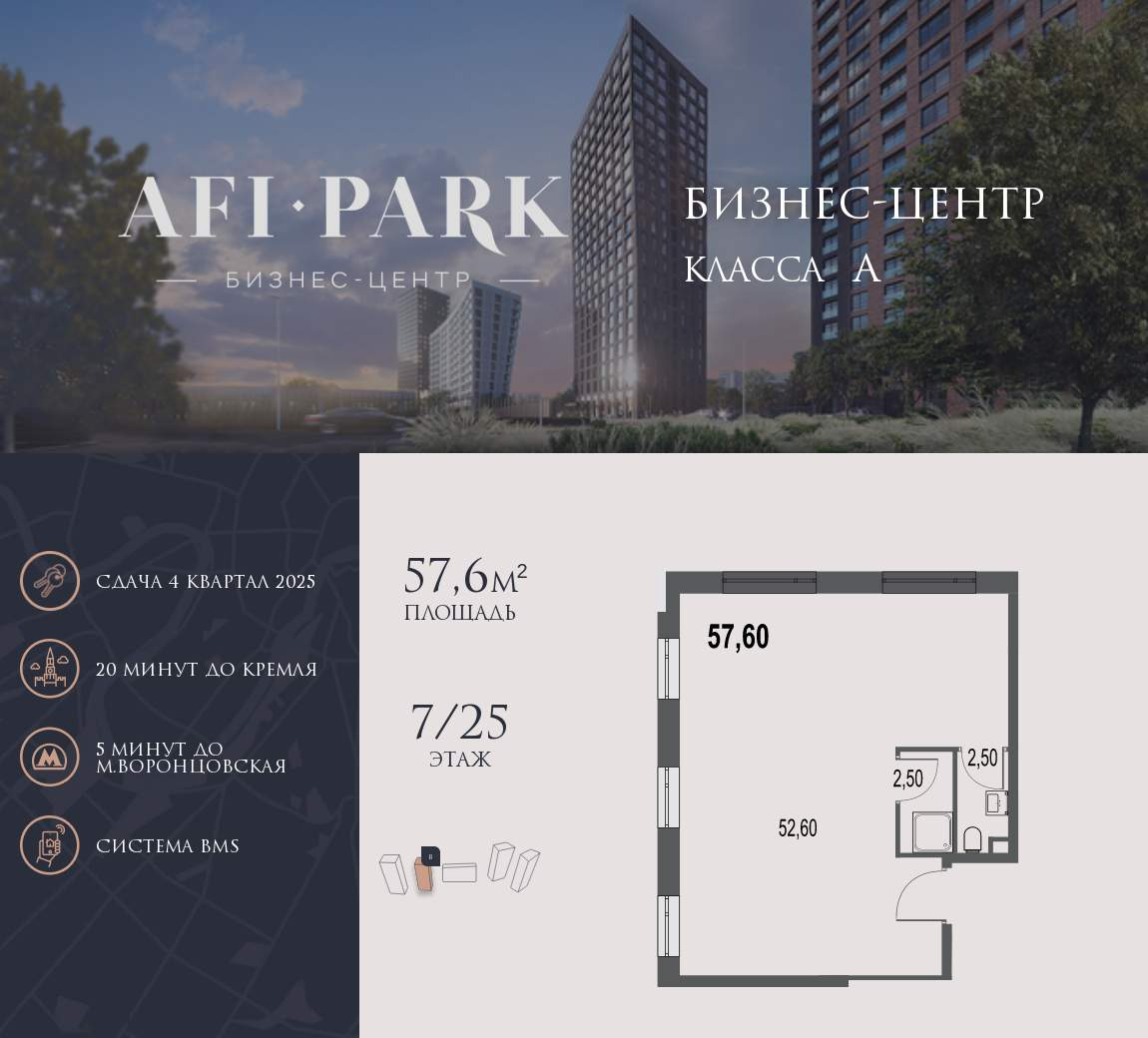 Продается просторное коммерческое помещение общей площадью 57,6 м2 на 7 этаже в строящемся бизнес-центре AFI Park. 21-этажный бизнес-центр AFI Park - современный бизнес-центр класса A с мультифункциональной экосистемой для бизнеса, панорамным остеклением и эргономичным пространством станет завершающим этапом клубного квартала. На первом этаже здания - лобби с комфортной зоной ожидания, кофе-поинтами и банкоматами, ресторан и торговая зона. Со второго этажа располагаются офисные помещения, формат которых предусматривает «нарезку» по желанию арендатора. Эргономичные openspace-планировки дают возможность организовать на каждом этаже функциональные рабочие зоны, переговорные комнаты, кабинеты руководителей, конференц-зал, бизнес-гостиные и зоны отдыха. За счет неглубокой посадки офисов и панорамного остекления все помещения хорошо освещаются естественным образом. Из окон открывается панорамный вид на город и Воронцовский парк, а высокие потолки и остекление «в пол» наполняют офисное пространство дополнительным воздухом и светом. Инфраструктура бизнес-центра создана с учетом ежедневных потребностей офисных резидентов. У входа расположена зона для посадки в такси и 11 гостевых машино-мест. В подземной части находится паркинг на 44 машино-места. На первом этаже - лобби с комфортной зоной ожидания, кофе-поинтами и банкоматами, ресторан и торговое пространство с сервисами быта. Здание оснащено централизованной системой автоматизации и управления, гарантирующей высокие стандарты контроля доступа и уровень комфорта. Принудительная приточно-вытяжная система вентиляции с подогревом и рециркуляцией воздуха, мультизональная система кондиционирования VRV, система освещения, пожарной сигнализации, управления высокоскоростными пассажирскими и грузовыми лифтами BLT, все контролируется диспетчером в автоматическом режиме через Building Management System, исключая человеческий фактор и неожиданные сбои. Круглосуточная охрана и видеонаблюдение внутри и по периметру здания позволяют эксплуатирующей компании в любое время заботиться о бизнес-центре, его резидентах и гостях, а консьерж-сервис окажет необходимые услуги по запросу резидентов в пределах здания. Стратегическое расположение между Ленинским проспектом и улицей Профсоюзной, на пересечении Старокалужского шоссе с улицей Академика Челомея обеспечивает удобную логистику на наземном транспорте, а пешая доступность станции метро БКЛ «Воронцовская» подключает локацию практически к любому району Москвы. [#7698884#]