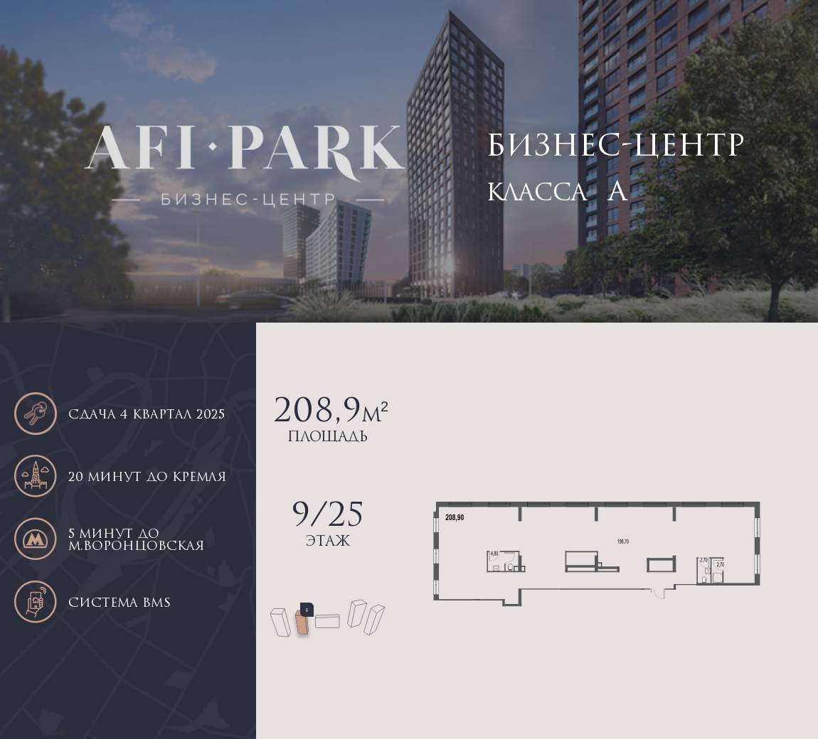 Продается просторное коммерческое помещение общей площадью 208,9 м2 на 9 этаже в строящемся бизнес-центре AFI Park. 21-этажный бизнес-центр AFI Park - современный бизнес-центр класса A с мультифункциональной экосистемой для бизнеса, панорамным остеклением и эргономичным пространством станет завершающим этапом клубного квартала. На первом этаже здания - лобби с комфортной зоной ожидания, кофе-поинтами и банкоматами, ресторан и торговая зона. Со второго этажа располагаются офисные помещения, формат которых предусматривает «нарезку» по желанию арендатора. Эргономичные openspace-планировки дают возможность организовать на каждом этаже функциональные рабочие зоны, переговорные комнаты, кабинеты руководителей, конференц-зал, бизнес-гостиные и зоны отдыха. За счет неглубокой посадки офисов и панорамного остекления все помещения хорошо освещаются естественным образом. Из окон открывается панорамный вид на город и Воронцовский парк, а высокие потолки и остекление «в пол» наполняют офисное пространство дополнительным воздухом и светом. Инфраструктура бизнес-центра создана с учетом ежедневных потребностей офисных резидентов. У входа расположена зона для посадки в такси и 11 гостевых машино-мест. В подземной части находится паркинг на 44 машино-места. На первом этаже - лобби с комфортной зоной ожидания, кофе-поинтами и банкоматами, ресторан и торговое пространство с сервисами быта. Здание оснащено централизованной системой автоматизации и управления, гарантирующей высокие стандарты контроля доступа и уровень комфорта. Принудительная приточно-вытяжная система вентиляции с подогревом и рециркуляцией воздуха, мультизональная система кондиционирования VRV, система освещения, пожарной сигнализации, управления высокоскоростными пассажирскими и грузовыми лифтами BLT, все контролируется диспетчером в автоматическом режиме через Building Management System, исключая человеческий фактор и неожиданные сбои. Круглосуточная охрана и видеонаблюдение внутри и по периметру здания позволяют эксплуатирующей компании в любое время заботиться о бизнес-центре, его резидентах и гостях, а консьерж-сервис окажет необходимые услуги по запросу резидентов в пределах здания. Стратегическое расположение между Ленинским проспектом и улицей Профсоюзной, на пересечении Старокалужского шоссе с улицей Академика Челомея обеспечивает удобную логистику на наземном транспорте, а пешая доступность станции метро БКЛ «Воронцовская» подключает локацию практически к любому району Москвы. [#7698901#]