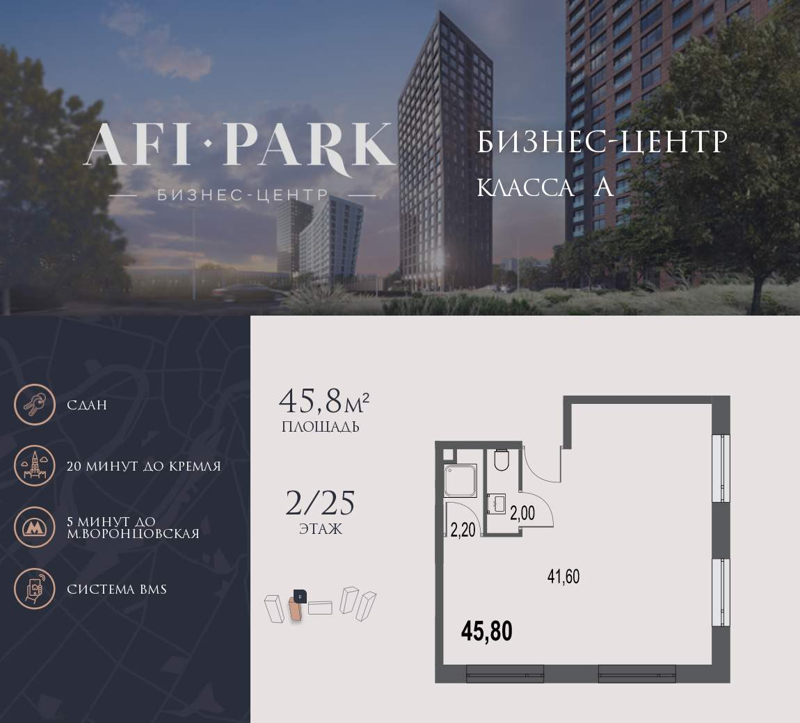 Продается просторное коммерческое помещение общей площадью 45,8 на 2 этаже в готовом бизнес-центре AFI Park. Строительство комплекса завершено. 21-этажный бизнес-центр AFI Park - современный бизнес-центр класса A с мультифункциональной экосистемой для бизнеса, панорамным остеклением и эргономичным пространством станет завершающим этапом клубного квартала. На первом этаже здания - лобби с комфортной зоной ожидания, кофе-поинтами и банкоматами, ресторан и торговая зона. Со второго этажа располагаются офисные помещения, формат которых предусматривает «нарезку» по желанию арендатора. Эргономичные openspace-планировки дают возможность организовать на каждом этаже функциональные рабочие зоны, переговорные комнаты, кабинеты руководителей, конференц-зал, бизнес-гостиные и зоны отдыха. За счет неглубокой посадки офисов и панорамного остекления все помещения хорошо освещаются естественным образом. Из окон открывается панорамный вид на город и Воронцовский парк, а высокие потолки и остекление «в пол» наполняют офисное пространство дополнительным воздухом и светом. Инфраструктура бизнес-центра создана с учетом ежедневных потребностей офисных резидентов. У входа расположена зона для посадки в такси и 11 гостевых машино-мест. В подземной части находится паркинг на 44 машино-места. На первом этаже - лобби с комфортной зоной ожидания, кофе-поинтами и банкоматами, ресторан и торговое пространство с сервисами быта. Здание оснащено централизованной системой автоматизации и управления, гарантирующей высокие стандарты контроля доступа и уровень комфорта. Принудительная приточно-вытяжная система вентиляции с подогревом и рециркуляцией воздуха, мультизональная система кондиционирования VRV, система освещения, пожарной сигнализации, управления высокоскоростными пассажирскими и грузовыми лифтами BLT, все контролируется диспетчером в автоматическом режиме через Building Management System, исключая человеческий фактор и неожиданные сбои. Круглосуточная охрана и видеонаблюдение внутри и по периметру здания позволяют эксплуатирующей компании в любое время заботиться о бизнес-центре, его резидентах и гостях, а консьерж-сервис окажет необходимые услуги по запросу резидентов в пределах здания. Стратегическое расположение между Ленинским проспектом и улицей Профсоюзной, на пересечении Старокалужского шоссе с улицей Академика Челомея обеспечивает удобную логистику на наземном транспорте, а пешая доступность станции метро БКЛ «Воронцовская» подключает локацию практически к любому району Москвы. [#7902447#]