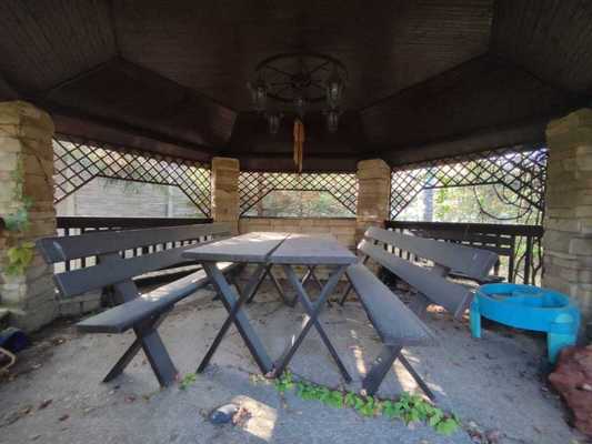 На участке ландшафтный дизайн, лес, плодовые деревья, беседка и мангал для шашлыка.