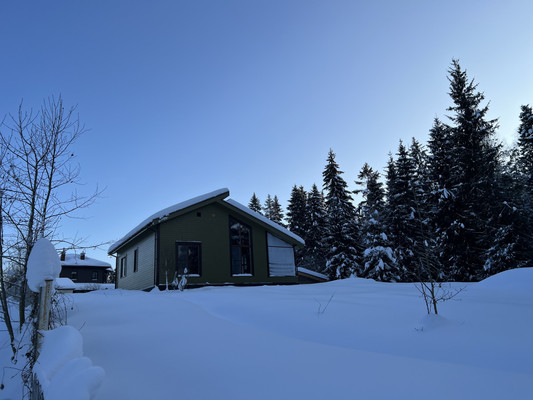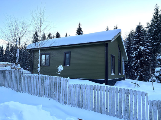 Планировка дома удобна для небольшой семьи. Перед входом в дом высокое крытое крыльцо. Внутри прихожая, кухня-гостиная 29 м2 с высокими окнами " в пол" и потолками до 5 м высотой, спальня 12 м2, из которой вход в совмещенный с/у с ванной. Отдельная детская/гостевая/кабинет 13 м2, общий с/у с умывальником . котельная.Из гостиной выход на просторную крытую летнюю террасу 17 м2, закрытую жидким стеклом.