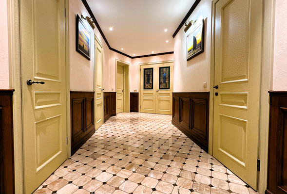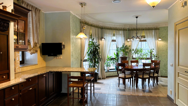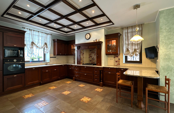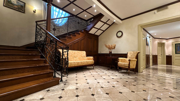 Арт. 132690129 Продаётся дом, расположенный в деревне Вялки на Егорьевском шоссе, в 19 километрах от МКАД.Этот особняк был построен по проекту, который сочетает в себе элементы сдержанной английской классики и современные решения. Все постройки на участке были тщательно продуманы и размещены в соответствии с общей концепцией, что обеспечивает комфорт и удобство использования.Основной дом с гаражом, гостевой дом, беседка и мастерская гармонично вписаны в ландшафт и учитывают особенности геометрии участка.Об основном домеДом имеет два этажа и мансарду. На первом этаже расположены просторная гостиная и кабинет-мастерская с камином и большими окнами, которые обеспечивают естественное освещение и создают уютную атмосферу.Через холл первого этажа можно попасть в кухню-столовую. В холле также находятся гостевой санузел, гардеробная, котельная и дополнительный выход на улицу.Кухня оборудована газовой плитой, оформленной в виде очага, а столовая зона расположена в эркере, что придаёт ей особый шарм и простор. В кухне также есть дополнительное помещение для размещения морозильника и хранения продуктов.На первом этаже предусмотрено водяное отопление пола, а пол покрыт натуральным мрамором.На втором этаже находятся библиотека, кабинет, мастер-спальня с ванной комнатой и джакузи, гостевая спальня с санузлом и гардеробная. Все эти помещения объединены просторным холлом второго этажа.Мансардный этаж отведён под зону отдыха с бильярдным столом, барной стойкой и мягкой мебелью. Здесь также расположены спальня и ванная комната, а также хозяйственная зона с прачечной и кладовой.В интерьере дома на втором этаже использованы дубовые доски, износостойкие ковровые покрытия с разнообразными орнаментами, тиснёные обои, витражи в дверях, мраморные подоконники в тон обоев и штор каждой комнаты, качественные ткани и портьеры. Английские классические камины и элегантная дубовая лестница с ажурным кованым ограждением создают единый образ этого дома.По всему дому установлена система при