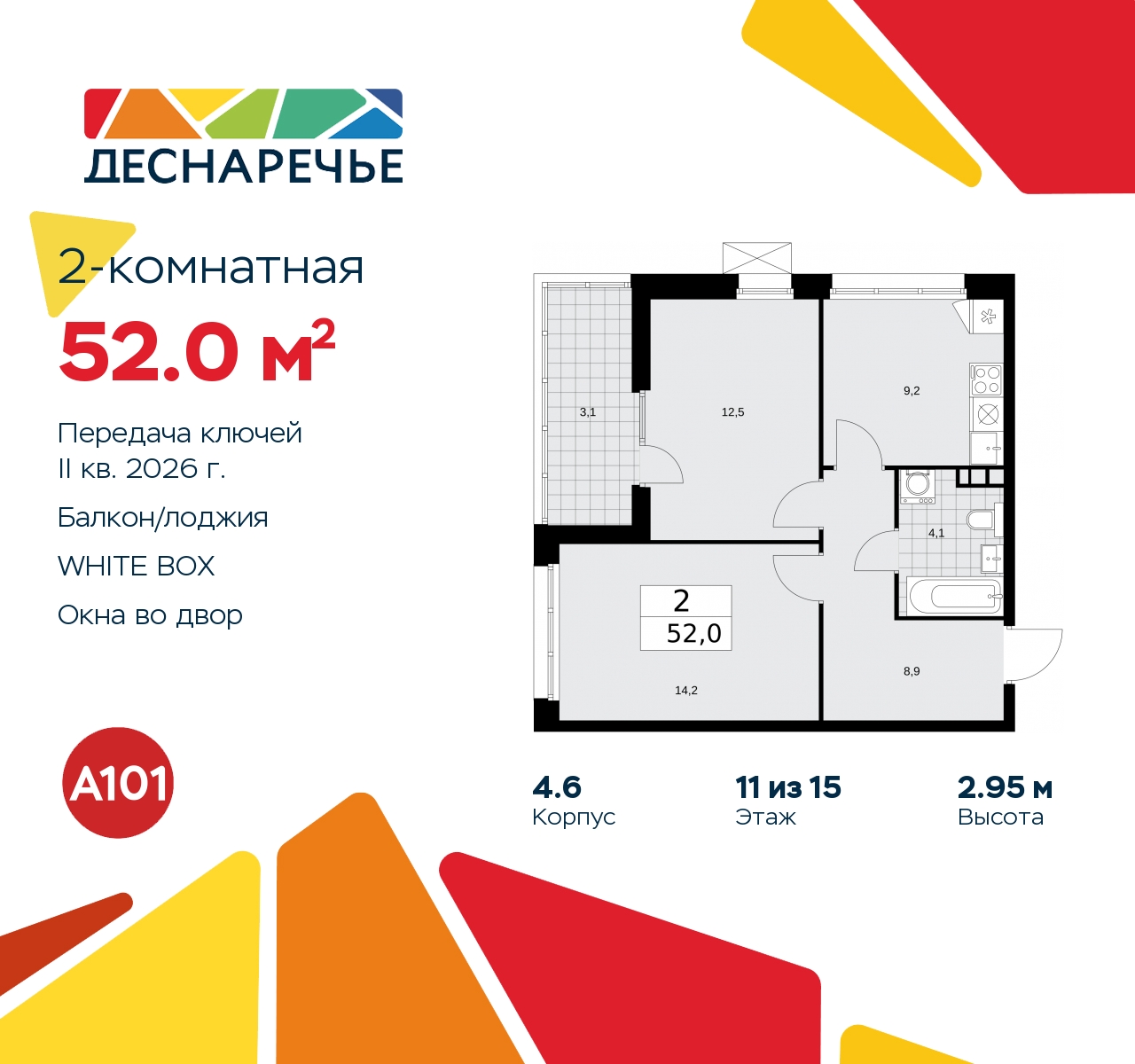 Просторная двухкомнатная квартира с отделкой в ЖК "Деснаречье" на 11 этаже. Общая площадь: 52 кв.м., жилая: 26.7 кв.м., площадь просторной кухни-столовой: 9.2 кв.м. Квартира угловая, очень светлая, естественная вентиляция при открытии окон. В квартире одна лоджия, один совмещенный санузел. Высота потолков 2.95 м. Эта квартира будет сдана с дизайнеркой отделкой "под ключ". Специально для вас мы разработали несколько решений дизайнерской отделки. В отделке используются только современный высококлассные материалы, на все работы предоставляется гарантия. В таком случае вы оплачиваете отделку в сегодняшних ценах, а эту стоимость вы можете разнести в ипотечных платежах. Квартира находится в корпусе 4.6. Дом монолитный, одноподъездный, высотой 15 этажей. На этаже 10 квартир. В подъезде 1 пассажирский и 1 грузовой лифт. Начало строительства - 3 квартал 2023 года. Окончание строительства - 2 квартал 2026 года. Оформление сделки по договору долевого участия. Артикул квартиры по базе застройщика 88К-4.6-1402. Масштабный проект "Деснаречье" на юго-западе Москвы, который включает три новых района («квартала»), объединённые общей идеей – воплотить в реальность мечты современных жителей столицы об интересном, комфортном и разноплановом городском пространстве в окружении рек и лесов, словно сошедших с полотен русских живописцев: - «Берег» оценят все, кому близка водная стихия: плеск волн, солнечные блики и прогулки вдоль тихого течения речи. - «Лес» утопает в зелени парков и лесов. Здесь соблюдён идеальный баланс загородного спокойствия и столичного комфорта. - «Парк», самый энергичный и яркий, отличается высокой концентрацией пространств для спорта и творчества. Жилой комплекс "Деснаречье" расположится в 12 км от МКАД по современному Калужскому шоссе. Внешний облик зданий соответствует современному стилю и стандартам, характерным и для других популярных проектов ГК «А101»: сочетание контрастных тонов, большое количество остекления, в котором отражается небо, гармония с природным окружением. Весь город - в вашем районе. Находиться на территории «15-минутного города» значит иметь всё необходимое для полноценной жизни в шаговой доступности. Маршруты в районе «Деснаречье» выстроены так, чтобы добраться до магазинов, парков, школ, салонов услуг и других объектов можно было всего за несколько минут пешком или на велосипеде. Двор закрытый от машин – это тишина, комфорт и безопасность, поэтому все машино-места (включая «семейные» и увеличенные, с возможностью установки роллетных шкафов) находятся в подземном паркинге. В паркинги можно спуститься на лифте из любого подъезда или по лестнице. Рядом с «Деснаречьем» в 2027 году планируется открытие станции метро «Десна», до которой будет удобно добраться пешком или на велосипеде. Дорога на автомобиле до перехватывающих парковок станций «Ольховая» и «Прокшино» займёт около 10 минут. В процессе реализации проекта будут появляться новые маршруты общественного транспорта по районам. Уже сейчас на Калужском шоссе развита сеть наземного транспорта: два десятка автобусов и маршрутных такси прибывают на остановки с интервалом 5–10 минут. (AQID02264689)