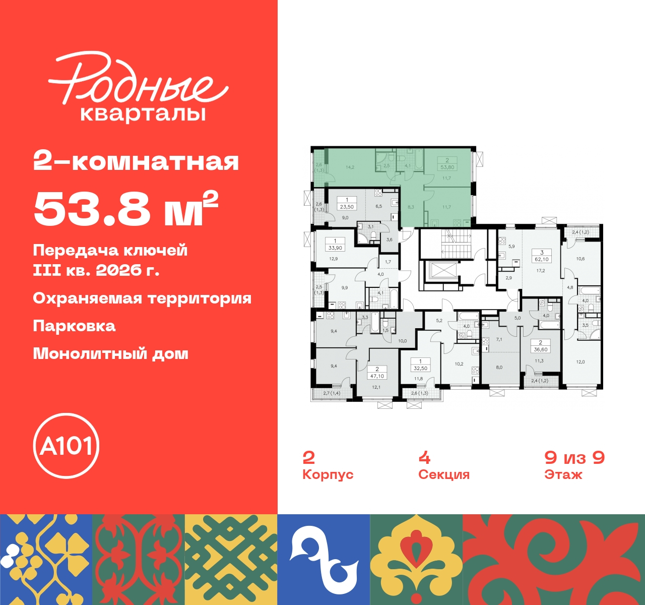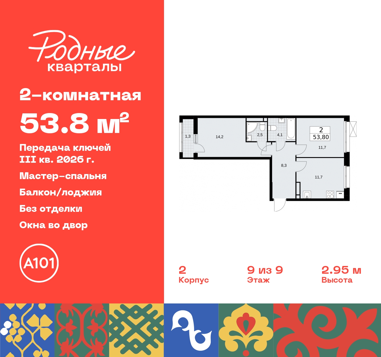 2-комн. квартира в ЖК "Родные кварталы" на 9 этаже. Квартира без отделки, после оформления собственности можно делать ремонт. Общая площадь: 53.8 кв.м., жилая: 25.9 кв.м., площадь просторной кухни-столовой: 11.7 кв.м. Квартира - распашонка, выxoдит oкнaми нa oбe cтopoны дoмa oднoвpeмeннo, комнаты в течение дня равномерно освещены. В квартире один балкон, два совмещенных санузла. Высота потолков 2.9 м. Дом монолитный, многоподъездный, высотой 9 этажей. Квартира находится в 4-й секции в корпусе 2. На этаже 7 квартир. В подъезде 1 грузовой лифт. Начало строительства - 4 квартал 2023 года. Окончание строительства - 3 квартал 2026 года. Оформление сделки по договору долевого участия. Артикул квартиры по базе застройщика 96К-2-200. Новый жилой комплекс "Родные кварталы" строится в уютной, экологически благополучной локации на юго-западе столицы. В ближайшем окружении – ухоженные малоэтажные посёлки и живописный Ульяновский лесопарк. Благодаря этому из окон откроются вдохновляющие виды, которые не исчезнут со временем за фасадами многоэтажек. Через весь район пройдёт главный бульвар, который свяжет набережную, жилые кварталы и площади в единое дружелюбное пространство, органично наполненное узнаваемыми элементами культурных традиций разных народов. В жилом комплексе создаются условия для комфортного отдыха и занятий спортом всех жителей. Здесь можно прогуляться и отдохнуть в лесопарке на берегу ручья, позаниматься на тренажёрах под открытым небом и спортивных площадках. Для малышей построят игровые комплексы, развивающие силу, координацию и ловкость. Всего в жилом комплексе будет оборудовано 6 га территории для спокойного отдыха и около 9 га — для активного. Подъезды в домах освещены в любое время суток, входы и вестибюль хорошо просматриваются с улицы. Витражное остекление обеспечивает приток естественного света днём, а вечером зажигаются светильники. В отделке домов используется сочетание вентилируемого фасада с облицовкой из фибробетонной плитки и штукатуркой. Комфортная высота домов соразмерна человеку и в среднем составляет 10 этажей. Все дома обеспечены собственными подземными паркингами. В них размещаются машино-места и кладовые. В паркинг или кладовую можно спуститься на лифте или по лестнице. В комплексе появятся бытовые сервисы, магазины, аптеки и другие торгово-бытовые объекты. В жилом районе «Родные кварталы» будут построены: - образовательный центр: школа на 1300 учеников и детский сад на 250 малышей, - два детских сада на 200 мест каждый (один из них сдаётся в 1-й очереди). В транспортной доступности уже работают: - школа № 41 и детский сад — по Боровскому шоссе, - школа № 2057 и детский сад — на запад от района, в дер. Марушкино. ЖК «Родные кварталы» строится в Новомосковском округе столицы, в 15 минутах на автомобиле от аэропорта «Внуково». Район обеспечен удобными выездами на три крупные современные автотрассы. Здесь уже работает и активно развивается система наземного общественного транспорта, включая междугородние рейсы. Интенсивное развитие локации обеспечивают две действующие станции крупных транспортных линий: метро (станция «Внуково») и МЦД (станция «Толстопальцево»). (AQID02295518)