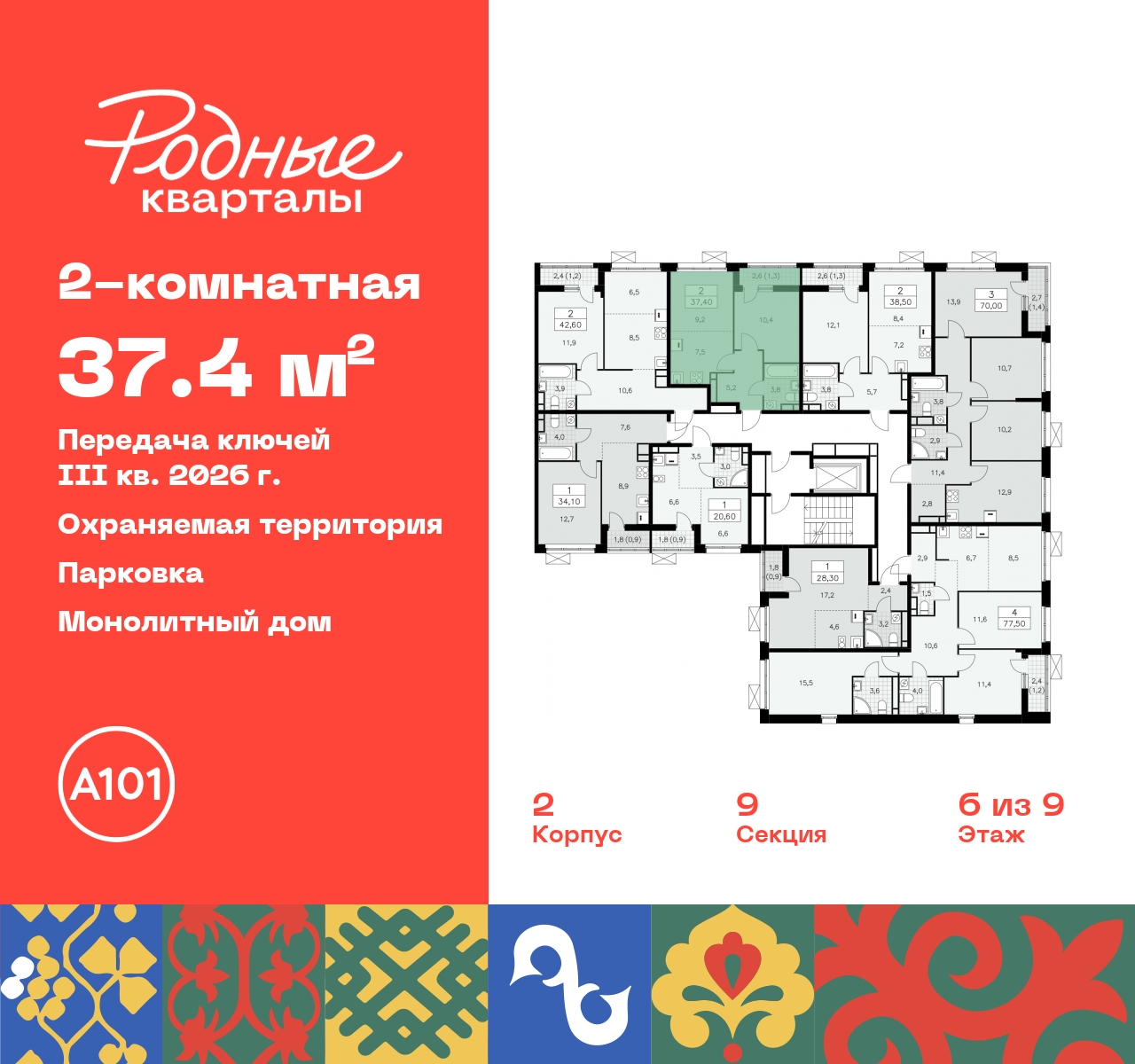 Просторная 2-комн. квартира с европланировкой в ЖК "Родные кварталы" на 6 этаже. Квартира без отделки, после получения ключей можно делать ремонт. Общая площадь: 37.4 кв.м., жилая: 19.6 кв.м., общая площадь гостиной-столовой с кухонной зоной: 16.7 кв.м. Европейская планировка, кухня и гостиная объединены в одно просторное помещение. Комнаты изолированные, все окна выходят на одну сторону. В квартире одна лоджия, один совмещенный санузел. Высота потолков 2.9 м. Имеется ниша под гардероб. Дом монолитный, многоподъездный, высотой 9 этажей. Квартира находится в 9-й секции в корпусе 2. На этаже 8 квартир. В подъезде 1 грузовой лифт. Начало строительства - 4 квартал 2023 года. Окончание строительства - 3 квартал 2026 года. Оформление сделки по договору долевого участия. Артикул квартиры по базе застройщика 96К-2-412. Новый жилой комплекс "Родные кварталы" строится в уютной, экологически благополучной локации на юго-западе столицы. В ближайшем окружении – ухоженные малоэтажные посёлки и живописный Ульяновский лесопарк. Благодаря этому из окон откроются вдохновляющие виды, которые не исчезнут со временем за фасадами многоэтажек. Через весь район пройдёт главный бульвар, который свяжет набережную, жилые кварталы и площади в единое дружелюбное пространство, органично наполненное узнаваемыми элементами культурных традиций разных народов. В жилом комплексе создаются условия для комфортного отдыха и занятий спортом всех жителей. Здесь можно прогуляться и отдохнуть в лесопарке на берегу ручья, позаниматься на тренажёрах под открытым небом и спортивных площадках. Для малышей построят игровые комплексы, развивающие силу, координацию и ловкость. Всего в жилом комплексе будет оборудовано 6 га территории для спокойного отдыха и около 9 га — для активного. Подъезды в домах освещены в любое время суток, входы и вестибюль хорошо просматриваются с улицы. Витражное остекление обеспечивает приток естественного света днём, а вечером зажигаются светильники. В отделке домов используется сочетание вентилируемого фасада с облицовкой из фибробетонной плитки и штукатуркой. Комфортная высота домов соразмерна человеку и в среднем составляет 10 этажей. Все дома обеспечены собственными подземными паркингами. В них размещаются машино-места и кладовые. В паркинг или кладовую можно спуститься на лифте или по лестнице. В комплексе появятся бытовые сервисы, магазины, аптеки и другие торгово-бытовые объекты. В жилом районе «Родные кварталы» будут построены: - образовательный центр: школа на 1300 учеников и детский сад на 250 малышей, - два детских сада на 200 мест каждый (один из них сдаётся в 1-й очереди). В транспортной доступности уже работают: - школа № 41 и детский сад — по Боровскому шоссе, - школа № 2057 и детский сад — на запад от района, в дер. Марушкино. ЖК «Родные кварталы» строится в Новомосковском округе столицы, в 15 минутах на автомобиле от аэропорта «Внуково». Район обеспечен удобными выездами на три крупные современные автотрассы. Здесь уже работает и активно развивается система наземного общественного транспорта, включая междугородние рейсы. Интенсивное развитие локации обеспечивают две действующие станции крупных транспортных линий: метро (станция «Внуково») и МЦД (станция «Толстопальцево»). (AQID02295730)