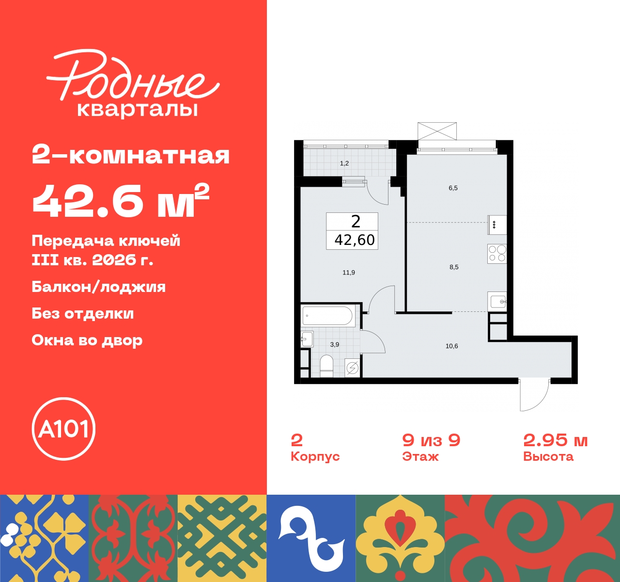 - Общая площадь 42.6 м²