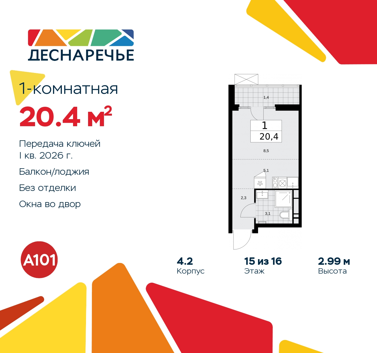 Однокомнатная квартира-студия от застройщика в ЖК "Деснаречье" на 15 этаже. Квартира без отделки, после оформления собственности можно делать ремонт. Общая площадь: 20.4 кв.м., площадь гостиной 13.6 кв.м., из которых 5.1 кв.м. выделено под кухонную зону. Все окна выходят на одну сторону. В квартире один балкон, один совмещенный санузел. Высота потолков 2.99 м. Эта квартира предлагается без отделки. Будут установлены стеклопакеты с повышенной тепло- и шумоизоляцией, в квартиру заведены все коммуникации. Вы сможете в полном объеме реализовать ваши идеи обустройства вашего комфортного дома. Для тех, кто ценит время и не хочет дополнительных трат на ремонт мы предлагаем квартиры с предчистовой и дизайнерской отделкой. Дом монолитный, многоподъездный, переменной этажности, от 7 до 16 этажей. Квартира находится в 1-й секции высотой 16 этажей в корпусе 4.2. На этаже 6 квартир. В подъезде 1 пассажирский и 1 грузовой лифт. Начало строительства - 3 квартал 2023 года. Окончание строительства - 1 квартал 2026 года. Оформление сделки по договору долевого участия. Артикул квартиры по базе застройщика 88К-4.2-347. Масштабный проект "Деснаречье" на юго-западе Москвы, который включает три новых района («квартала»), объединённые общей идеей – воплотить в реальность мечты современных жителей столицы об интересном, комфортном и разноплановом городском пространстве в окружении рек и лесов, словно сошедших с полотен русских живописцев: - «Берег» оценят все, кому близка водная стихия: плеск волн, солнечные блики и прогулки вдоль тихого течения речи. - «Лес» утопает в зелени парков и лесов. Здесь соблюдён идеальный баланс загородного спокойствия и столичного комфорта. - «Парк», самый энергичный и яркий, отличается высокой концентрацией пространств для спорта и творчества. Жилой комплекс "Деснаречье" расположится в 12 км от МКАД по современному Калужскому шоссе. Внешний облик зданий соответствует современному стилю и стандартам, характерным и для других популярных проектов ГК «А101»: сочетание контрастных тонов, большое количество остекления, в котором отражается небо, гармония с природным окружением. Весь город - в вашем районе. Находиться на территории «15-минутного города» значит иметь всё необходимое для полноценной жизни в шаговой доступности. Маршруты в районе «Деснаречье» выстроены так, чтобы добраться до магазинов, парков, школ, салонов услуг и других объектов можно было всего за несколько минут пешком или на велосипеде. Двор закрытый от машин – это тишина, комфорт и безопасность, поэтому все машино-места (включая «семейные» и увеличенные, с возможностью установки роллетных шкафов) находятся в подземном паркинге. В паркинги можно спуститься на лифте из любого подъезда или по лестнице. Рядом с «Деснаречьем» в 2027 году планируется открытие станции метро «Десна», до которой будет удобно добраться пешком или на велосипеде. Дорога на автомобиле до перехватывающих парковок станций «Ольховая» и «Прокшино» займёт около 10 минут. В процессе реализации проекта будут появляться новые маршруты общественного транспорта по районам. Уже сейчас на Калужском шоссе развита сеть наземного транспорта: два десятка автобусов и маршрутных такси прибывают на остановки с интервалом 5–10 минут. (AQID02263598)