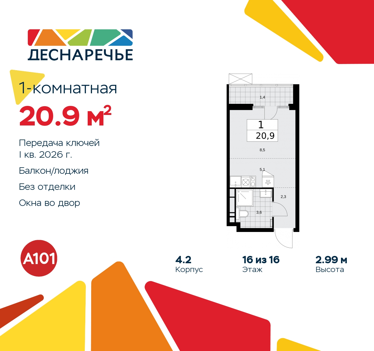 1-комн. квартира-студия от застройщика в ЖК "Деснаречье" на 16 этаже. Квартира без отделки, новый собственник может сделать ремонт по своему дизайн-проекту. Общая площадь: 20.9 кв.м., площадь гостиной 13.6 кв.м., из которых 5.1 кв.м. выделено под кухонную зону. Все окна выходят на одну сторону. В квартире один балкон, один совмещенный санузел. Высота потолков 2.99 м. Эта квартира предлагается без отделки. Будут установлены стеклопакеты с повышенной тепло- и шумоизоляцией, в квартиру заведены все коммуникации. Вы сможете в полном объеме реализовать ваши идеи обустройства вашего комфортного дома. Для тех, кто ценит время и не хочет дополнительных трат на ремонт мы предлагаем квартиры с предчистовой и дизайнерской отделкой. Дом монолитный, многоподъездный, переменной этажности, от 7 до 16 этажей. Квартира находится в 1-й секции высотой 16 этажей в корпусе 4.2. На этаже 6 квартир. В подъезде 1 пассажирский и 1 грузовой лифт. Начало строительства - 3 квартал 2023 года. Окончание строительства - 1 квартал 2026 года. Оформление сделки по договору долевого участия. Артикул квартиры по базе застройщика 88К-4.2-354. Масштабный проект "Деснаречье" на юго-западе Москвы, который включает три новых района («квартала»), объединённые общей идеей – воплотить в реальность мечты современных жителей столицы об интересном, комфортном и разноплановом городском пространстве в окружении рек и лесов, словно сошедших с полотен русских живописцев: - «Берег» оценят все, кому близка водная стихия: плеск волн, солнечные блики и прогулки вдоль тихого течения речи. - «Лес» утопает в зелени парков и лесов. Здесь соблюдён идеальный баланс загородного спокойствия и столичного комфорта. - «Парк», самый энергичный и яркий, отличается высокой концентрацией пространств для спорта и творчества. Жилой комплекс "Деснаречье" расположится в 12 км от МКАД по современному Калужскому шоссе. Внешний облик зданий соответствует современному стилю и стандартам, характерным и для других популярных проектов ГК «А101»: сочетание контрастных тонов, большое количество остекления, в котором отражается небо, гармония с природным окружением. Весь город - в вашем районе. Находиться на территории «15-минутного города» значит иметь всё необходимое для полноценной жизни в шаговой доступности. Маршруты в районе «Деснаречье» выстроены так, чтобы добраться до магазинов, парков, школ, салонов услуг и других объектов можно было всего за несколько минут пешком или на велосипеде. Двор закрытый от машин – это тишина, комфорт и безопасность, поэтому все машино-места (включая «семейные» и увеличенные, с возможностью установки роллетных шкафов) находятся в подземном паркинге. В паркинги можно спуститься на лифте из любого подъезда или по лестнице. Рядом с «Деснаречьем» в 2027 году планируется открытие станции метро «Десна», до которой будет удобно добраться пешком или на велосипеде. Дорога на автомобиле до перехватывающих парковок станций «Ольховая» и «Прокшино» займёт около 10 минут. В процессе реализации проекта будут появляться новые маршруты общественного транспорта по районам. Уже сейчас на Калужском шоссе развита сеть наземного транспорта: два десятка автобусов и маршрутных такси прибывают на остановки с интервалом 5–10 минут. (AQID02263605)