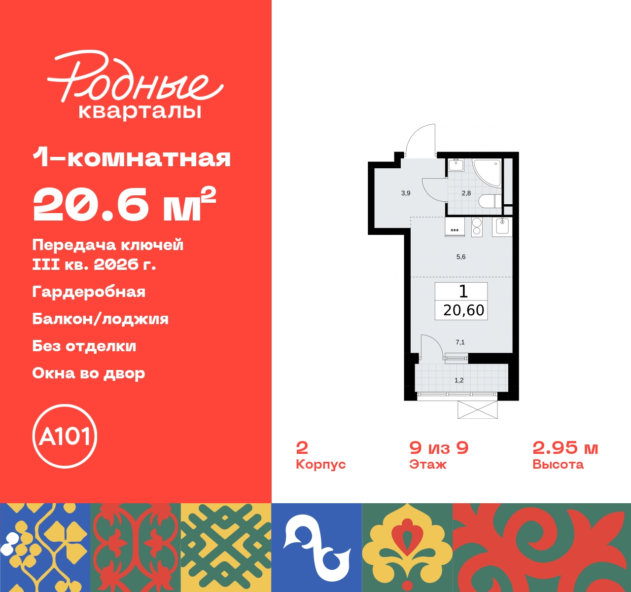 Однокомнатная квартира-студия в ЖК "Родные кварталы" на 9 этаже. Квартира без отделки, полностью готова к ремонту. Общая площадь: 20.6 кв.м., площадь гостиной 12.7 кв.м., из которых 5.6 кв.м. выделено под кухонную зону. Все окна выходят на одну сторону. В квартире один балкон, один совмещенный санузел. Высота потолков 2.9 м. Имеется ниша под гардероб. Дом монолитный, многоподъездный, высотой 9 этажей. Квартира находится в 6-й секции в корпусе 2. На этаже 5 квартир. В подъезде 1 грузовой лифт. Начало строительства - 4 квартал 2023 года. Окончание строительства - 3 квартал 2026 года. Оформление сделки по договору долевого участия. Артикул квартиры по базе застройщика 96К-2-277. Новый жилой комплекс "Родные кварталы" строится в уютной, экологически благополучной локации на юго-западе столицы. В ближайшем окружении – ухоженные малоэтажные посёлки и живописный Ульяновский лесопарк. Благодаря этому из окон откроются вдохновляющие виды, которые не исчезнут со временем за фасадами многоэтажек. Через весь район пройдёт главный бульвар, который свяжет набережную, жилые кварталы и площади в единое дружелюбное пространство, органично наполненное узнаваемыми элементами культурных традиций разных народов. В жилом комплексе создаются условия для комфортного отдыха и занятий спортом всех жителей. Здесь можно прогуляться и отдохнуть в лесопарке на берегу ручья, позаниматься на тренажёрах под открытым небом и спортивных площадках. Для малышей построят игровые комплексы, развивающие силу, координацию и ловкость. Всего в жилом комплексе будет оборудовано 6 га территории для спокойного отдыха и около 9 га — для активного. Подъезды в домах освещены в любое время суток, входы и вестибюль хорошо просматриваются с улицы. Витражное остекление обеспечивает приток естественного света днём, а вечером зажигаются светильники. В отделке домов используется сочетание вентилируемого фасада с облицовкой из фибробетонной плитки и штукатуркой. Комфортная высота домов соразмерна человеку и в среднем составляет 10 этажей. Все дома обеспечены собственными подземными паркингами. В них размещаются машино-места и кладовые. В паркинг или кладовую можно спуститься на лифте или по лестнице. В комплексе появятся бытовые сервисы, магазины, аптеки и другие торгово-бытовые объекты. В жилом районе «Родные кварталы» будут построены: - образовательный центр: школа на 1300 учеников и детский сад на 250 малышей, - два детских сада на 200 мест каждый (один из них сдаётся в 1-й очереди). В транспортной доступности уже работают: - школа № 41 и детский сад — по Боровскому шоссе, - школа № 2057 и детский сад — на запад от района, в дер. Марушкино. ЖК «Родные кварталы» строится в Новомосковском округе столицы, в 15 минутах на автомобиле от аэропорта «Внуково». Район обеспечен удобными выездами на три крупные современные автотрассы. Здесь уже работает и активно развивается система наземного общественного транспорта, включая междугородние рейсы. Интенсивное развитие локации обеспечивают две действующие станции крупных транспортных линий: метро (станция «Внуково») и МЦД (станция «Толстопальцево»). (AQID02295595)