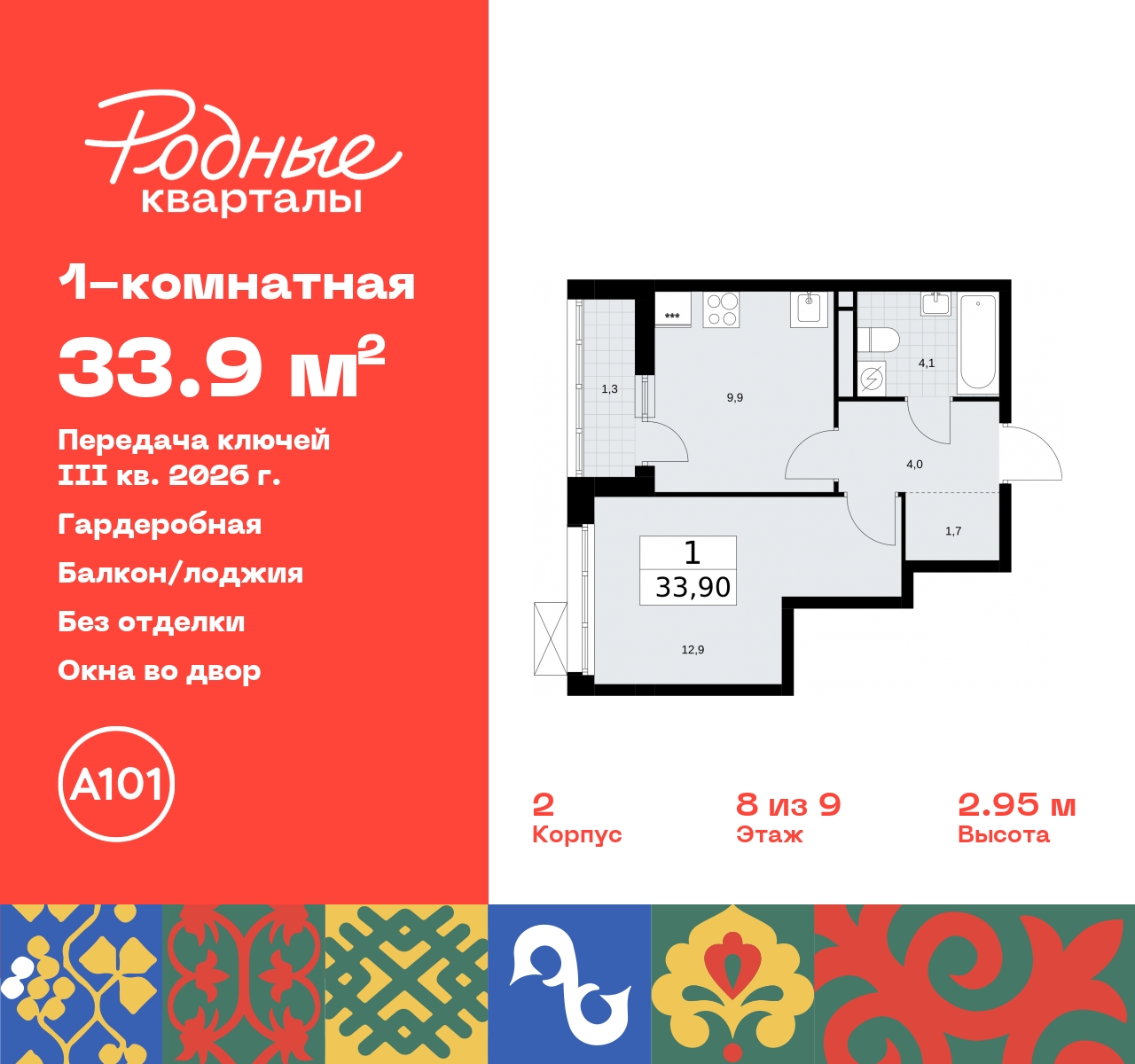 1-комн. квартира в ЖК "Родные кварталы" на 8 этаже. Квартира без отделки, полностью готова к чистовой отделке и дальнейшему ремонту. Общая площадь: 33.9 кв.м., жилая: 12.9 кв.м., площадь просторной кухни-столовой: 9.9 кв.м. Все окна выходят на одну сторону. В квартире одна лоджия, один совмещенный санузел. Высота потолков 2.9 м. Имеется ниша под гардероб. Дом монолитный, многоподъездный, высотой 9 этажей. Квартира находится в 7-й секции в корпусе 2. На этаже 7 квартир. В подъезде 1 грузовой лифт. Начало строительства - 4 квартал 2023 года. Окончание строительства - 3 квартал 2026 года. Оформление сделки по договору долевого участия. Артикул квартиры по базе застройщика 96К-2-325. ПРЕДЛОЖЕНИЯ ОТ ЗАСТРОЙЩИКА В ОКТЯБРЕ 2025: Ипотека от 13,9 % для всех! На весь срок. "Семейная ипотека" вернулась. Ставка от 3,5 % на весь срок! Без удорожания! Выгодное ипотечное комбо: Ипотека от 2200 р./мес. и от 6 % после рождения ребёнка! Ипотека для всех "Держи пять!" - ставка 5 % на 2 года! *более подробную информацию по скидкам и акциям уточняйте в отделе продаж Новый жилой комплекс "Родные кварталы" строится в уютной, экологически благополучной локации на юго-западе столицы. В ближайшем окружении – ухоженные малоэтажные посёлки и живописный Ульяновский лесопарк. Благодаря этому из окон откроются вдохновляющие виды, которые не исчезнут со временем за фасадами многоэтажек. Через весь район пройдёт главный бульвар, который свяжет набережную, жилые кварталы и площади в единое дружелюбное пространство, органично наполненное узнаваемыми элементами культурных традиций разных народов. В жилом комплексе создаются условия для комфортного отдыха и занятий спортом всех жителей. Здесь можно прогуляться и отдохнуть в лесопарке на берегу ручья, позаниматься на тренажёрах под открытым небом и спортивных площадках. Для малышей построят игровые комплексы, развивающие силу, координацию и ловкость. Всего в жилом комплексе будет оборудовано 6 га территории для спокойного отдыха и около 9 га — для активного. Подъезды в домах освещены в любое время суток, входы и вестибюль хорошо просматриваются с улицы. Витражное остекление обеспечивает приток естественного света днём, а вечером зажигаются светильники. В отделке домов используется сочетание вентилируемого фасада с облицовкой из фибробетонной плитки и штукатуркой. Комфортная высота домов соразмерна человеку и в среднем составляет 10 этажей. Все дома обеспечены собственными подземными паркингами. В них размещаются машино-места и кладовые. В паркинг или кладовую можно спуститься на лифте или по лестнице. В комплексе появятся бытовые сервисы, магазины, аптеки и другие торгово-бытовые объекты. В жилом районе «Родные кварталы» будут построены: - образовательный центр: школа на 1300 учеников и детский сад на 250 малышей, - два детских сада на 200 мест каждый (один из них сдаётся в 1-й очереди). В транспортной доступности уже работают: - школа № 41 и детский сад — по Боровскому шоссе, - школа № 2057 и детский сад — на запад от района, в дер. Марушкино. ЖК «Родные кварталы» строится в Новомосковском округе столицы, в 15 минутах на автомобиле от аэропорта «Внуково». Район обеспечен удобными выездами на три крупные современные автотрассы. Здесь уже работает и активно развивается система наземного общественного транспорта, включая междугородние рейсы. Интенсивное развитие л