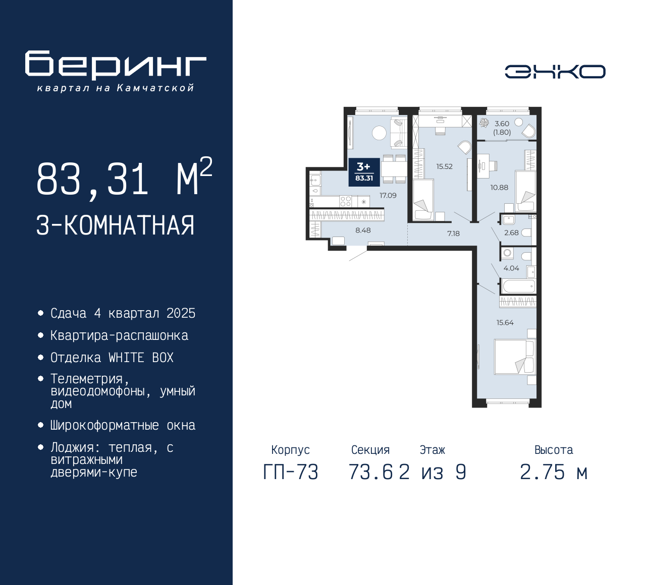Просторная 3-комн. квартира в ЖК "Беринг" на 2 этаже. Квартира без отделки, новый владелец может сделать ремонт по своему проекту. Общая площадь: 83.31 кв.м., жилая: 42.04 кв.м., площадь просторной кухни-столовой: 17.09 кв.м. Квартира - распашонка, без проходных комнат, окна выходят на paзные стороны дома. В квартире одна лоджия, один совмещенный и один раздельный санузел. Высота потолков 2.75 м. Дом монолитный, многоподъездный, переменной этажности, от 9 до 22 этажей. Квартира находится в 73.6-й секции высотой 9 этажей в корпусе ГП-73. На этаже 5 квартир. В подъезде 1 пассажирский и 1 грузовой лифт. Окончание строительства - 4 квартал 2025 года. Оформление сделки по договору долевого участия. Подобно знаменитому исследователю, мы чувствуем себя первооткрывателями этой локации. Хотим показать новую суть места, сформировать для вас жизненный опыт, которого ещё не было. Беринг — район зелёного цвета. Беринг — район, который откроется вам с другой стороны. Впечатлит новым уровнем комфорта и качеством жизни. Беринг — открытие на карте города. Первый квартал расположен в районе Тура, в границах улиц: Камчатская – Западносибирская – Энтузиастов. Вокруг уже есть всё для того, чтобы ежедневная рутина была лишь частью жизни и не доставляла дискомфорта. Школы и детские сады, магазины и аптеки, поликлиника, места для семейного отдыха, пеших и велопрогулок, и даже рыбалки. Масштабное озеленение дворов — визитная карточка ЭНКО и ваш оазис спокойствия, чтобы отвлечься от повседневности. Раскидистые деревья, кустарники, травы и цветы — осталось остановиться, вдохнуть и расслабиться, глядя на эту природную красоту. Стилистика подъездов продолжает концепцию Беринга, вдохновлённого Камчаткой: сдержанный, но при этом впечатляющий дизайн соседствует с удобством и функциональностью. (AQID02316314)