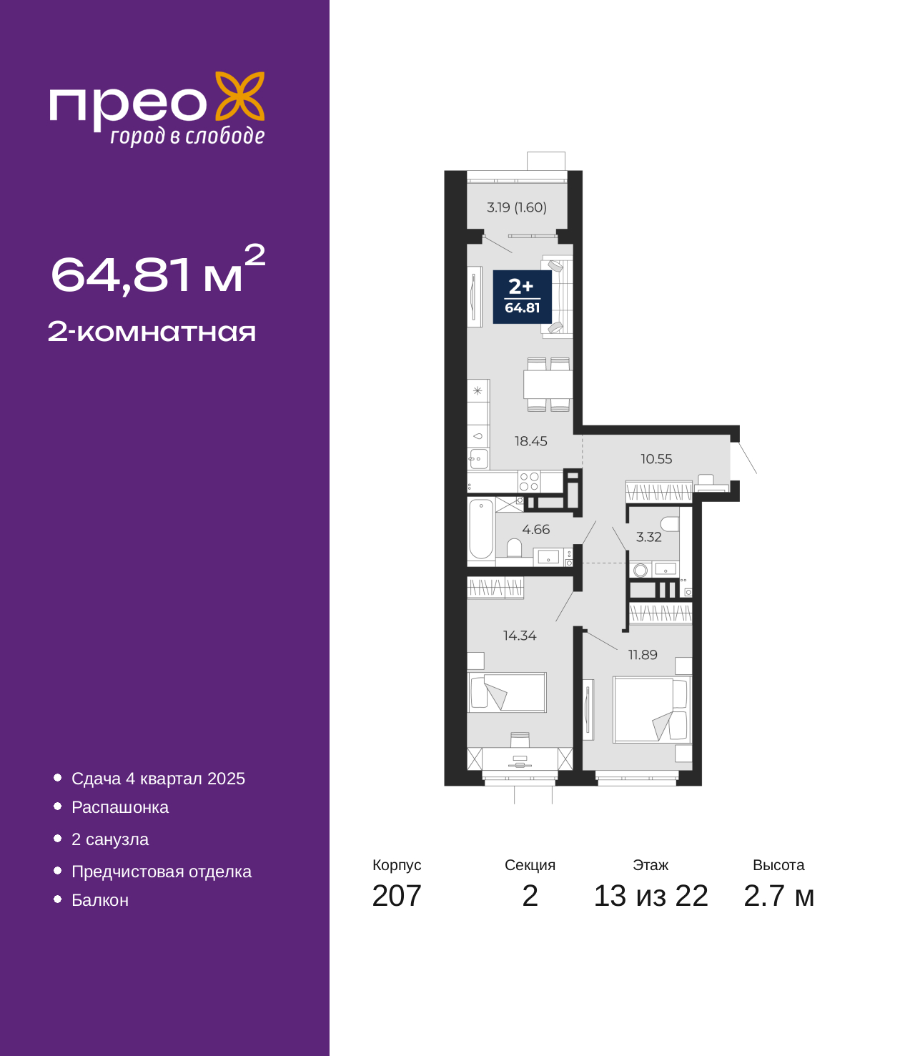 Просторная 2-комн. квартира с предчистовой отделкой в ЖК "Прео" на 13 этаже. Общая площадь: 64.81 кв.м., жилая: 26.23 кв.м., площадь просторной кухни-столовой: 18.45 кв.м. Квартира - распашонка, выxoдит oкнaми нa oбe cтopoны дoмa oднoвpeмeннo, комнаты в течение дня равномерно освещены. В квартире один балкон, один совмещенный и один раздельный санузел. Высота потолков 2.7 м. Дом монолитный, двухподъездный, высотой 22 этажа. Квартира находится во 2-й секции в корпусе 207. На этаже 8 квартир. В подъезде 1 пассажирский и 1 грузовой лифт. Окончание строительства - 4 квартал 2025 года. Оформление сделки по договору долевого участия. Преображенский — один из самых привлекательных районов для жизни! Это полностью самостоятельный жилой район с точки зрения инфраструктуры. Преображенский находится между Московским и Червишевским трактами в квартале улиц Закалужская — Вьюжная — Александра Протозанова. Не нужно ждать, когда появится инфраструктура — переезжайте на всё готовое. Вблизи расположены действующие школа и детский сад. В этом году откроется еще один сад, а в следующем году — школа. По соседству с Преображенским запланировано строительство городского парка «Комарово» площадью 38 гектар. За 10 минут можно доехать на автомобиле до крупных ТРЦ: «Лента», «Кристалл», «Леруа Мерлен», «Метро» и «Ашан». С 2018 года в районе открыт Соседский центр — пространство, созданное для формирования добрососедской среды, совместного досуга, общения и реализации соседских инициатив. Здесь проходят встречи соседей, а также сами жители района организовывают мероприятия. Организатором такого события может стать любой желающий. В квартирах выполнена качественная предчистовая отделка. Гладкие стены с финишным выравниванием по маякам. Ровный потолок для установки натяжного потолка. Установлены пятикамерные окна с двойным стеклопакетом (3 стекла). Дизайнерские холлы с видеонаблюдением, безбарьерным и прозрачным входом – всегда светло и спокойно. На первом этаже есть просторные колясочные, где все жители могут оставлять свои коляски и велосипеды. В Преображенском есть всё, что нужно для активного отдыха и занятий спортом. Мы сделали большое футбольное поле с безопасным покрытием. Также установили хоккейный корт, который оборудован по всем необходимым стандартам. Во дворах можно делать упражнения на специальных площадках с турниками. Весь район мы обустроили велодорожками, которые связаны в единый маршрут. У нас есть сухие фонтаны, бьющие из земли, деревья, веревки, сетки, скалодром, газон, песок и резинка — осталось просто дать своему ребенку право на свободную игру. По-настоящему хорошие дворы — это те, которые дети предпочитают соцсетям и телевизору. Аккредитация в банках: ПАО Банк «ВТБ», ПАО «Газпромбанк», ПАО «Банк Уралсиб», «Сбербанк России», ОАО «Альфа-Банк» и других. (AQID02355923)
