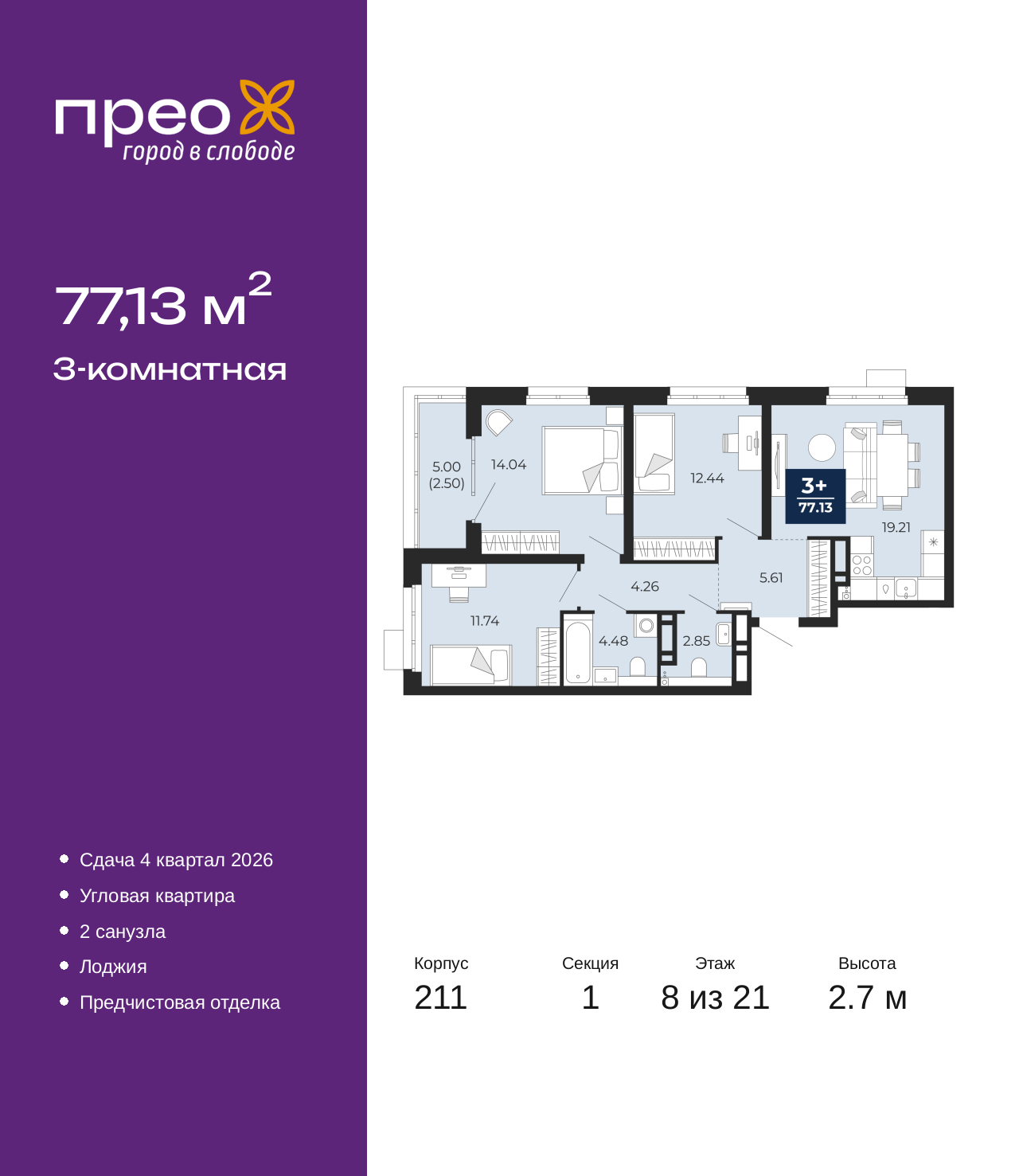 Трехкомнатная квартира от застройщика с предчистовой отделкой в ЖК "Прео" на 8 этаже. Общая площадь: 77.13 кв.м., жилая: 38.22 кв.м., площадь просторной кухни-столовой: 19.21 кв.м. Угловая квартира, идеально подойдет любителям тишины и панорамных видов. В квартире одна лоджия, один совмещенный и один раздельный санузел. Высота потолков 2.7 м. Дом монолитный, черырехподъездный, переменной этажности, от 14 до 21 этажей. Квартира находится в 1-й секции высотой 21 этаж в корпусе 211. На этаже 8 квартир. В подъезде 1 пассажирский и 1 грузовой лифт. Окончание строительства - 4 квартал 2026 года. Оформление сделки по договору долевого участия. Преображенский — один из самых привлекательных районов для жизни! Это полностью самостоятельный жилой район с точки зрения инфраструктуры. Преображенский находится между Московским и Червишевским трактами в квартале улиц Закалужская — Вьюжная — Александра Протозанова. Не нужно ждать, когда появится инфраструктура — переезжайте на всё готовое. Вблизи расположены действующие школа и детский сад. В этом году откроется еще один сад, а в следующем году — школа. По соседству с Преображенским запланировано строительство городского парка «Комарово» площадью 38 гектар. За 10 минут можно доехать на автомобиле до крупных ТРЦ: «Лента», «Кристалл», «Леруа Мерлен», «Метро» и «Ашан». С 2018 года в районе открыт Соседский центр — пространство, созданное для формирования добрососедской среды, совместного досуга, общения и реализации соседских инициатив. Здесь проходят встречи соседей, а также сами жители района организовывают мероприятия. Организатором такого события может стать любой желающий. В квартирах выполнена качественная предчистовая отделка. Гладкие стены с финишным выравниванием по маякам. Ровный потолок для установки натяжного потолка. Установлены пятикамерные окна с двойным стеклопакетом (3 стекла). Дизайнерские холлы с видеонаблюдением, безбарьерным и прозрачным входом – всегда светло и спокойно. На первом этаже есть просторные колясочные, где все жители могут оставлять свои коляски и велосипеды. В Преображенском есть всё, что нужно для активного отдыха и занятий спортом. Мы сделали большое футбольное поле с безопасным покрытием. Также установили хоккейный корт, который оборудован по всем необходимым стандартам. Во дворах можно делать упражнения на специальных площадках с турниками. Весь район мы обустроили велодорожками, которые связаны в единый маршрут. У нас есть сухие фонтаны, бьющие из земли, деревья, веревки, сетки, скалодром, газон, песок и резинка — осталось просто дать своему ребенку право на свободную игру. По-настоящему хорошие дворы — это те, которые дети предпочитают соцсетям и телевизору. Аккредитация в банках: ПАО «Банк Уралсиб», ПАО «Газпромбанк», ПАО Банк «ВТБ», «Сбербанк России», ОАО «Альфа-Банк» и других. (AQID02427732)