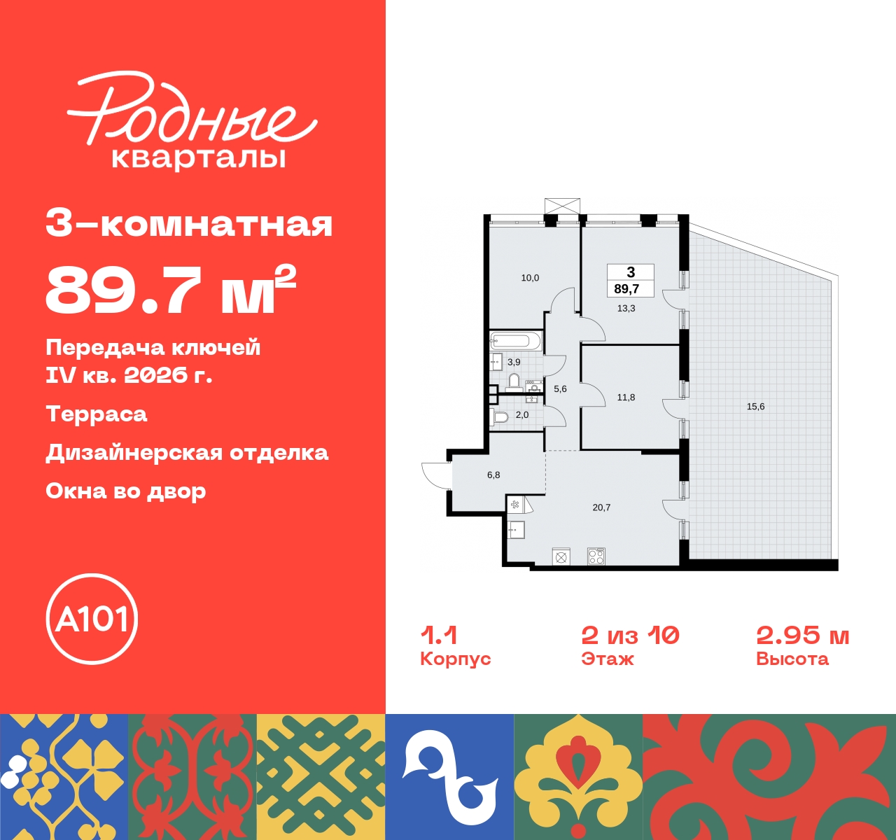 3-комн. квартира от застройщика с отделкой в ЖК "Родные кварталы" на 2 этаже. Общая площадь: 89.7 кв.м., жилая: 35.1 кв.м., площадь просторной кухни-столовой: 20.7 кв.м. Угловая квартира, очень светлая, естественная вентиляция при открытии окон. В квартире один балкон, один совмещенный и один раздельный санузел. Наличие террасы в квартире открывает возможность для создания зон отдыха в кругу семьи и друзей. Высота потолков 2.9 м. Квартира находится в корпусе 1.1. Дом монолитный, одноподъездный, высотой 10 этажей. На этаже 11 квартир. В подъезде 1 пассажирский и 1 грузовой лифт. Начало строительства - 4 квартал 2023 года. Окончание строительства - 4 квартал 2026 года. Оформление сделки по договору долевого участия. Артикул квартиры по базе застройщика 96К-1.1-11. ПРЕДЛОЖЕНИЯ ОТ ЗАСТРОЙЩИКА В ОКТЯБРЕ 2025: Ипотека от 13,9 % для всех! На весь срок. "Семейная ипотека" вернулась. Ставка от 3,5 % на весь срок! Без удорожания! Выгодное ипотечное комбо: Ипотека от 2200 р./мес. и от 6 % после рождения ребёнка! Ипотека для всех "Держи пять!" - ставка 5 % на 2 года! *более подробную информацию по скидкам и акциям уточняйте в отделе продаж Новый жилой комплекс "Родные кварталы" строится в уютной, экологически благополучной локации на юго-западе столицы. В ближайшем окружении – ухоженные малоэтажные посёлки и живописный Ульяновский лесопарк. Благодаря этому из окон откроются вдохновляющие виды, которые не исчезнут со временем за фасадами многоэтажек. Через весь район пройдёт главный бульвар, который свяжет набережную, жилые кварталы и площади в единое дружелюбное пространство, органично наполненное узнаваемыми элементами культурных традиций разных народов. В жилом комплексе создаются условия для комфортного отдыха и занятий спортом всех жителей. Здесь можно прогуляться и отдохнуть в лесопарке на берегу ручья, позаниматься на тренажёрах под открытым небом и спортивных площадках. Для малышей построят игровые комплексы, развивающие силу, координацию и ловкость. Всего в жилом комплексе будет оборудовано 6 га территории для спокойного отдыха и около 9 га — для активного. Подъезды в домах освещены в любое время суток, входы и вестибюль хорошо просматриваются с улицы. Витражное остекление обеспечивает приток естественного света днём, а вечером зажигаются светильники. В отделке домов используется сочетание вентилируемого фасада с облицовкой из фибробетонной плитки и штукатуркой. Комфортная высота домов соразмерна человеку и в среднем составляет 10 этажей. Все дома обеспечены собственными подземными паркингами. В них размещаются машино-места и кладовые. В паркинг или кладовую можно спуститься на лифте или по лестнице. В комплексе появятся бытовые сервисы, магазины, аптеки и другие торгово-бытовые объекты. В жилом районе «Родные кварталы» будут построены: - образовательный центр: школа на 1300 учеников и детский сад на 250 малышей, - два детских сада на 200 мест каждый (один из них сдаётся в 1-й очереди). В транспортной доступности уже работают: - школа № 41 и детский сад — по Боровскому шоссе, - школа № 2057 и детский сад — на запад от района, в дер. Марушкино. ЖК «Родные кварталы» строится в Новомосковском округе столицы, в 15 минутах на автомобиле от аэропорта «Внуково». Район обеспечен удобными выездами на три крупные современные автотрассы. Здесь уже работает и активно развивается система наземн