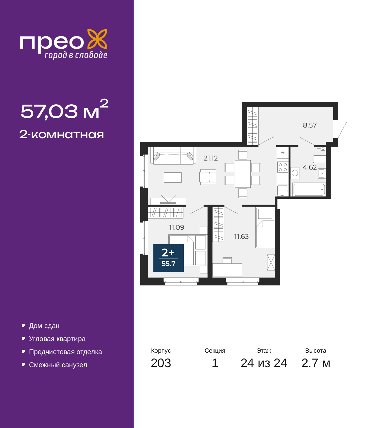 Просторная двухкомнатная квартира с предчистовой отделкой в ЖК "Прео" на 24 этаже. Общая площадь: 57.03 кв.м., жилая: 22.72 кв.м., площадь просторной кухни-столовой: 21.12 кв.м. Угловая квартира, идеально подойдет любителям тишины и панорамных видов. В квартире один совмещенный санузел. Высота потолков 2.7 м. Квартира находится в корпусе 203. Дом монолитный, одноподъездный, высотой 24 этажа. На этаже 14 квартир. В подъезде 2 грузовых лифта. Строительство завершено, дом сдан в 4 квартале 2024 года. Оформление сделки по договору купли-продажи. Преображенский — один из самых привлекательных районов для жизни! Это полностью самостоятельный жилой район с точки зрения инфраструктуры. Преображенский находится между Московским и Червишевским трактами в квартале улиц Закалужская — Вьюжная — Александра Протозанова. Не нужно ждать, когда появится инфраструктура — переезжайте на всё готовое. Вблизи расположены действующие школа и детский сад. В этом году откроется еще один сад, а в следующем году — школа. По соседству с Преображенским запланировано строительство городского парка «Комарово» площадью 38 гектар. За 10 минут можно доехать на автомобиле до крупных ТРЦ: «Лента», «Кристалл», «Леруа Мерлен», «Метро» и «Ашан». С 2018 года в районе открыт Соседский центр — пространство, созданное для формирования добрососедской среды, совместного досуга, общения и реализации соседских инициатив. Здесь проходят встречи соседей, а также сами жители района организовывают мероприятия. Организатором такого события может стать любой желающий. В квартирах выполнена качественная предчистовая отделка. Гладкие стены с финишным выравниванием по маякам. Ровный потолок для установки натяжного потолка. Установлены пятикамерные окна с двойным стеклопакетом (3 стекла). Дизайнерские холлы с видеонаблюдением, безбарьерным и прозрачным входом – всегда светло и спокойно. На первом этаже есть просторные колясочные, где все жители могут оставлять свои коляски и велосипеды. В Преображенском есть всё, что нужно для активного отдыха и занятий спортом. Мы сделали большое футбольное поле с безопасным покрытием. Также установили хоккейный корт, который оборудован по всем необходимым стандартам. Во дворах можно делать упражнения на специальных площадках с турниками. Весь район мы обустроили велодорожками, которые связаны в единый маршрут. У нас есть сухие фонтаны, бьющие из земли, деревья, веревки, сетки, скалодром, газон, песок и резинка — осталось просто дать своему ребенку право на свободную игру. По-настоящему хорошие дворы — это те, которые дети предпочитают соцсетям и телевизору. Аккредитация в банках: «Сбербанк России», ПАО Банк «ВТБ», ПАО «Банк Уралсиб», ОАО «Альфа-Банк», ПАО «Газпромбанк» и других. (AQID02278568)