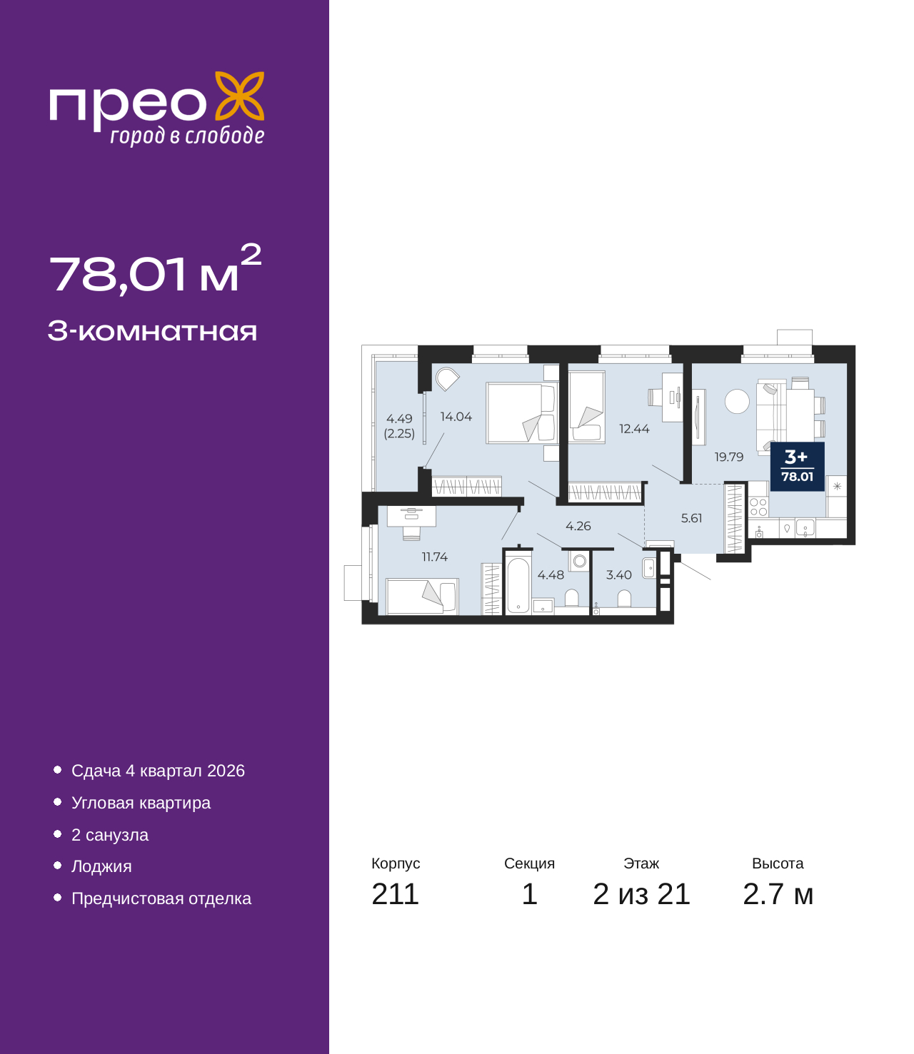 Продается трехкомнатная квартира с предчистовой отделкой в ЖК "Прео" на 2 этаже. Общая площадь: 78.01 кв.м., жилая: 38.22 кв.м., площадь просторной кухни-столовой: 19.79 кв.м. Квартира угловая, окна oбecпeчивaют paвнoмepнoe ocвeщeниe в тeчeниe дня. В квартире одна лоджия, один совмещенный и один раздельный санузел. Высота потолков 2.7 м. Дом монолитный, черырехподъездный, переменной этажности, от 14 до 21 этажей. Квартира находится в 1-й секции высотой 21 этаж в корпусе 211. На этаже 8 квартир. В подъезде 1 пассажирский и 1 грузовой лифт. Окончание строительства - 4 квартал 2026 года. Оформление сделки по договору долевого участия. Преображенский — один из самых привлекательных районов для жизни! Это полностью самостоятельный жилой район с точки зрения инфраструктуры. Преображенский находится между Московским и Червишевским трактами в квартале улиц Закалужская — Вьюжная — Александра Протозанова. Не нужно ждать, когда появится инфраструктура — переезжайте на всё готовое. Вблизи расположены действующие школа и детский сад. В этом году откроется еще один сад, а в следующем году — школа. По соседству с Преображенским запланировано строительство городского парка «Комарово» площадью 38 гектар. За 10 минут можно доехать на автомобиле до крупных ТРЦ: «Лента», «Кристалл», «Леруа Мерлен», «Метро» и «Ашан». С 2018 года в районе открыт Соседский центр — пространство, созданное для формирования добрососедской среды, совместного досуга, общения и реализации соседских инициатив. Здесь проходят встречи соседей, а также сами жители района организовывают мероприятия. Организатором такого события может стать любой желающий. В квартирах выполнена качественная предчистовая отделка. Гладкие стены с финишным выравниванием по маякам. Ровный потолок для установки натяжного потолка. Установлены пятикамерные окна с двойным стеклопакетом (3 стекла). Дизайнерские холлы с видеонаблюдением, безбарьерным и прозрачным входом – всегда светло и спокойно. На первом этаже есть просторные колясочные, где все жители могут оставлять свои коляски и велосипеды. В Преображенском есть всё, что нужно для активного отдыха и занятий спортом. Мы сделали большое футбольное поле с безопасным покрытием. Также установили хоккейный корт, который оборудован по всем необходимым стандартам. Во дворах можно делать упражнения на специальных площадках с турниками. Весь район мы обустроили велодорожками, которые связаны в единый маршрут. У нас есть сухие фонтаны, бьющие из земли, деревья, веревки, сетки, скалодром, газон, песок и резинка — осталось просто дать своему ребенку право на свободную игру. По-настоящему хорошие дворы — это те, которые дети предпочитают соцсетям и телевизору. Аккредитация в банках: «Сбербанк России», ПАО «Банк Уралсиб», ОАО «Альфа-Банк», ПАО Банк «ВТБ», ПАО «Газпромбанк» и других. (AQID02427719)