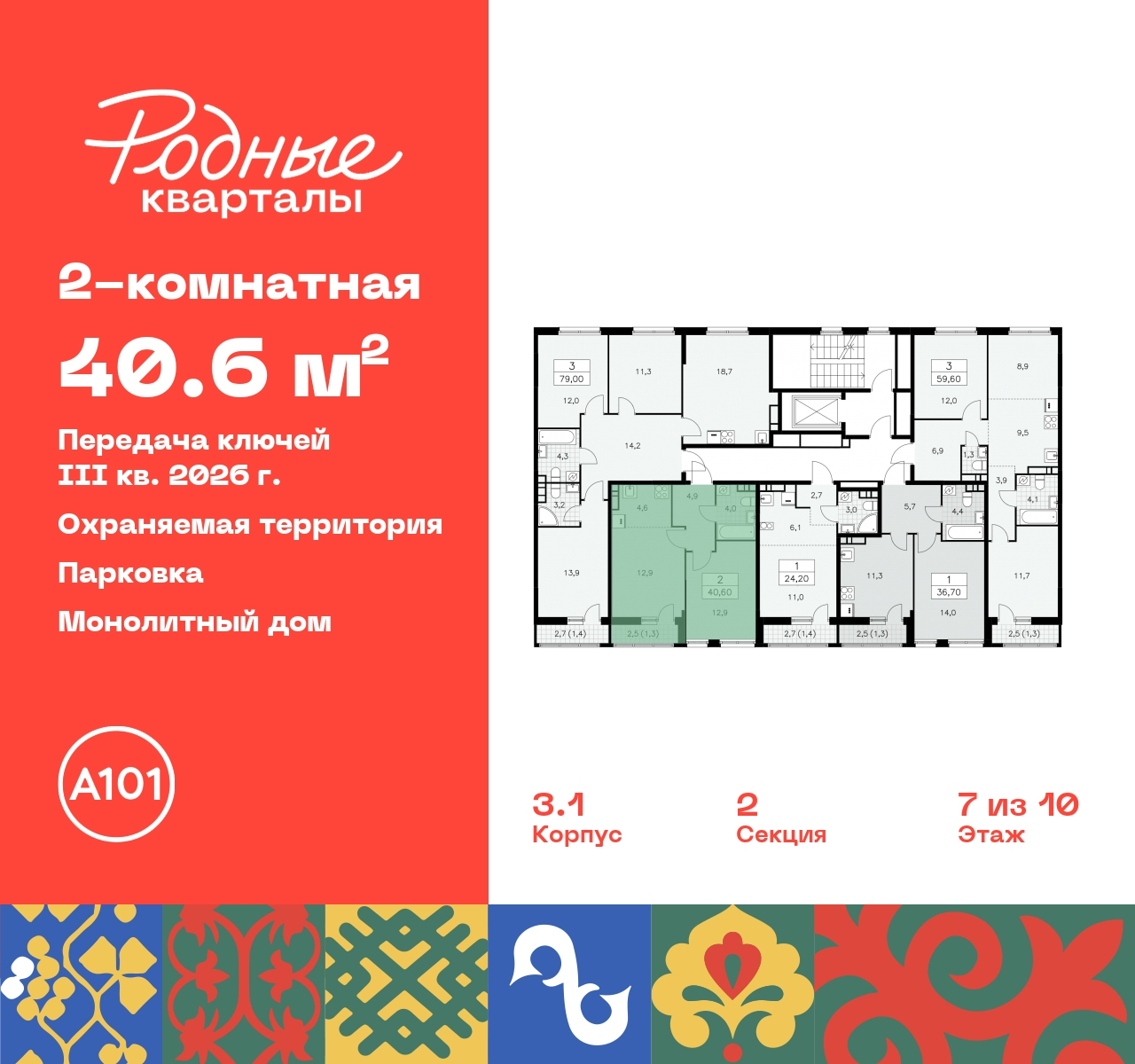 2-комн. квартира с европланировкой в ЖК "Родные кварталы" на 7 этаже. Квартира без отделки, новый собственник может сделать ремонт по своему дизайн-проекту. Общая площадь: 40.6 кв.м., жилая: 25.8 кв.м., суммарная площадь гостиной-столовой с кухонной зоной: 17.5 кв.м. Европейская планировка, кухня и гостиная объединены в одно просторное помещение. Комнаты изолированные, все окна выходят на одну сторону. В квартире одна лоджия, один совмещенный санузел. Высота потолков 2.95 м. Дом монолитный, черырехподъездный, высотой 10 этажей. Квартира находится во 2-й секции в корпусе 3.1. На этаже 5 квартир. В подъезде 1 грузовой лифт. Начало строительства - 2 квартал 2024 года. Окончание строительства - 3 квартал 2026 года. Оформление сделки по договору долевого участия. Артикул квартиры по базе застройщика 96К-3.1-74. ПРЕДЛОЖЕНИЯ ОТ ЗАСТРОЙЩИКА В ОКТЯБРЕ 2025: Ипотека от 13,9 % для всех! На весь срок. "Семейная ипотека" вернулась. Ставка от 3,5 % на весь срок! Без удорожания! Выгодное ипотечное комбо: Ипотека от 2200 р./мес. и от 6 % после рождения ребёнка! Ипотека для всех "Держи пять!" - ставка 5 % на 2 года! *более подробную информацию по скидкам и акциям уточняйте в отделе продаж Новый жилой комплекс "Родные кварталы" строится в уютной, экологически благополучной локации на юго-западе столицы. В ближайшем окружении – ухоженные малоэтажные посёлки и живописный Ульяновский лесопарк. Благодаря этому из окон откроются вдохновляющие виды, которые не исчезнут со временем за фасадами многоэтажек. Через весь район пройдёт главный бульвар, который свяжет набережную, жилые кварталы и площади в единое дружелюбное пространство, органично наполненное узнаваемыми элементами культурных традиций разных народов. В жилом комплексе создаются условия для комфортного отдыха и занятий спортом всех жителей. Здесь можно прогуляться и отдохнуть в лесопарке на берегу ручья, позаниматься на тренажёрах под открытым небом и спортивных площадках. Для малышей построят игровые комплексы, развивающие силу, координацию и ловкость. Всего в жилом комплексе будет оборудовано 6 га территории для спокойного отдыха и около 9 га — для активного. Подъезды в домах освещены в любое время суток, входы и вестибюль хорошо просматриваются с улицы. Витражное остекление обеспечивает приток естественного света днём, а вечером зажигаются светильники. В отделке домов используется сочетание вентилируемого фасада с облицовкой из фибробетонной плитки и штукатуркой. Комфортная высота домов соразмерна человеку и в среднем составляет 10 этажей. Все дома обеспечены собственными подземными паркингами. В них размещаются машино-места и кладовые. В паркинг или кладовую можно спуститься на лифте или по лестнице. В комплексе появятся бытовые сервисы, магазины, аптеки и другие торгово-бытовые объекты. В жилом районе «Родные кварталы» будут построены: - образовательный центр: школа на 1300 учеников и детский сад на 250 малышей, - два детских сада на 200 мест каждый (один из них сдаётся в 1-й очереди). В транспортной доступности уже работают: - школа № 41 и детский сад — по Боровскому шоссе, - школа № 2057 и детский сад — на запад от района, в дер. Марушкино. ЖК «Родные кварталы» строится в Новомосковском округе столицы, в 15 минутах на автомобиле от аэропорта «Внуково». Район обеспечен удобными выездами на три крупные современные автотрассы. Здесь уже р