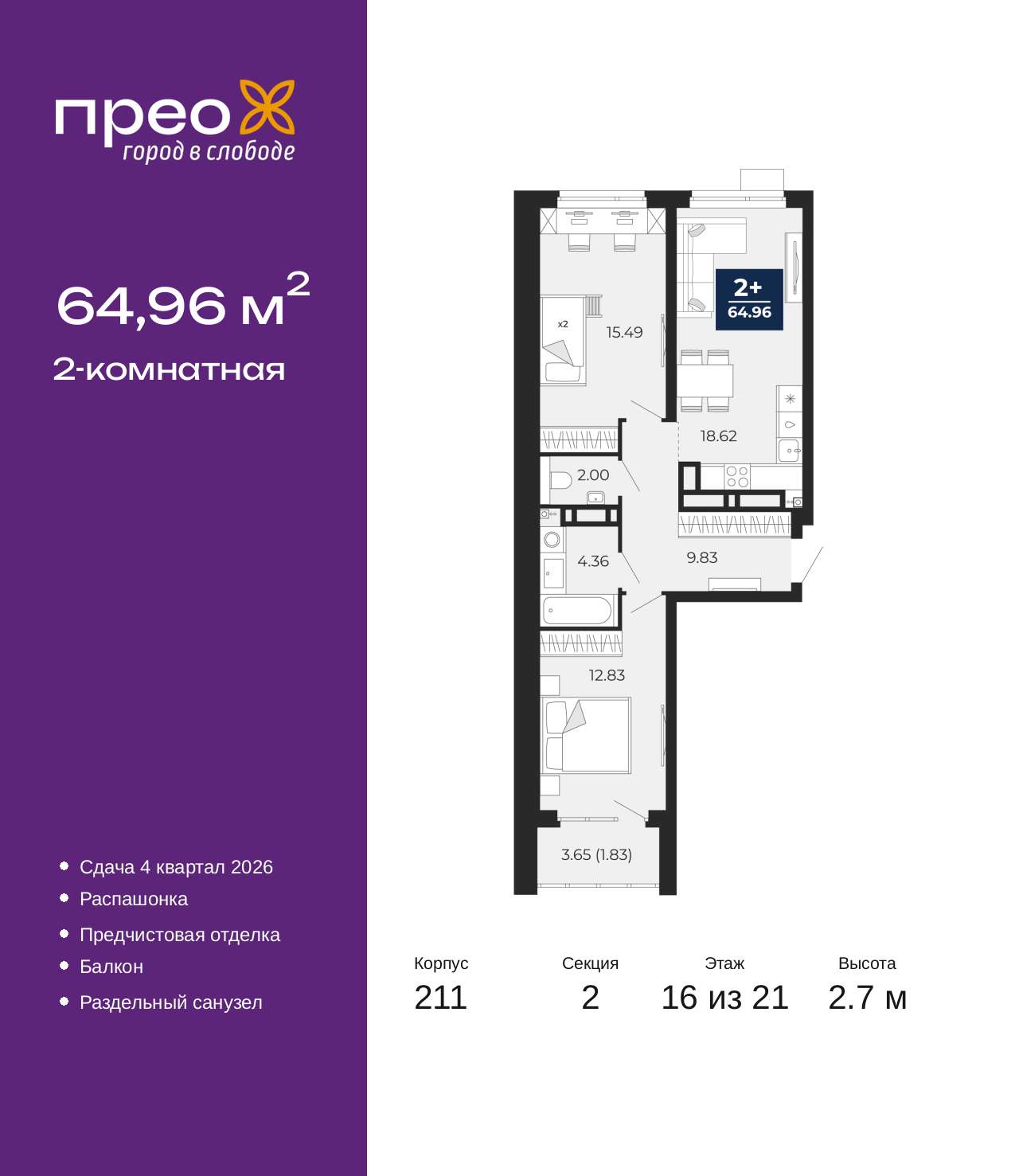 - Общая площадь 64.96 м²