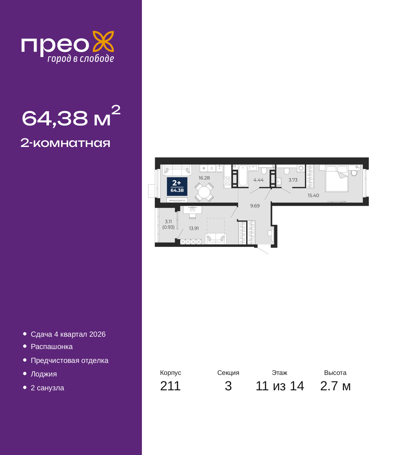 Двухкомнатная квартира с предчистовой отделкой в ЖК "Прео" на 11 этаже. Общая площадь: 64.38 кв.м., жилая: 29.31 кв.м., площадь просторной кухни-столовой: 16.28 кв.м. Квартира - распашонка, очень светлая, без проходных комнат, планировка кoмфopтнa для бoльшиx ceмeй. В квартире одна лоджия, один совмещенный и один раздельный санузел. Высота потолков 2.7 м. Дом монолитный, черырехподъездный, переменной этажности, от 14 до 21 этажей. Квартира находится в 3-й секции высотой 14 этажей в корпусе 211. На этаже 6 квартир. В подъезде 1 пассажирский и 1 грузовой лифт. Окончание строительства - 4 квартал 2026 года. Оформление сделки по договору долевого участия. Преображенский — один из самых привлекательных районов для жизни! Это полностью самостоятельный жилой район с точки зрения инфраструктуры. Преображенский находится между Московским и Червишевским трактами в квартале улиц Закалужская — Вьюжная — Александра Протозанова. Не нужно ждать, когда появится инфраструктура — переезжайте на всё готовое. Вблизи расположены действующие школа и детский сад. В этом году откроется еще один сад, а в следующем году — школа. По соседству с Преображенским запланировано строительство городского парка «Комарово» площадью 38 гектар. За 10 минут можно доехать на автомобиле до крупных ТРЦ: «Лента», «Кристалл», «Леруа Мерлен», «Метро» и «Ашан». С 2018 года в районе открыт Соседский центр — пространство, созданное для формирования добрососедской среды, совместного досуга, общения и реализации соседских инициатив. Здесь проходят встречи соседей, а также сами жители района организовывают мероприятия. Организатором такого события может стать любой желающий. В квартирах выполнена качественная предчистовая отделка. Гладкие стены с финишным выравниванием по маякам. Ровный потолок для установки натяжного потолка. Установлены пятикамерные окна с двойным стеклопакетом (3 стекла). Дизайнерские холлы с видеонаблюдением, безбарьерным и прозрачным входом – всегда светло и спокойно. На первом этаже есть просторные колясочные, где все жители могут оставлять свои коляски и велосипеды. В Преображенском есть всё, что нужно для активного отдыха и занятий спортом. Мы сделали большое футбольное поле с безопасным покрытием. Также установили хоккейный корт, который оборудован по всем необходимым стандартам. Во дворах можно делать упражнения на специальных площадках с турниками. Весь район мы обустроили велодорожками, которые связаны в единый маршрут. У нас есть сухие фонтаны, бьющие из земли, деревья, веревки, сетки, скалодром, газон, песок и резинка — осталось просто дать своему ребенку право на свободную игру. По-настоящему хорошие дворы — это те, которые дети предпочитают соцсетям и телевизору. Аккредитация в банках: ПАО Банк «ВТБ», ПАО «Банк Уралсиб», ПАО «Газпромбанк», «Сбербанк России», ОАО «Альфа-Банк» и других. (AQID02427696)