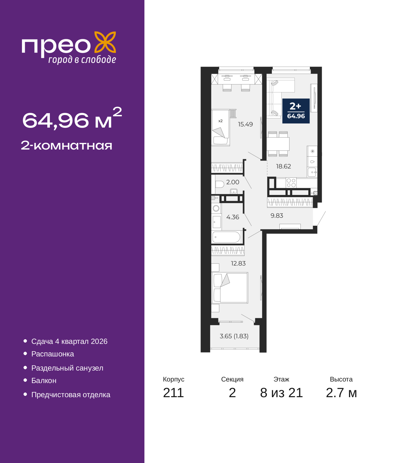 - Общая площадь 64.96 м²