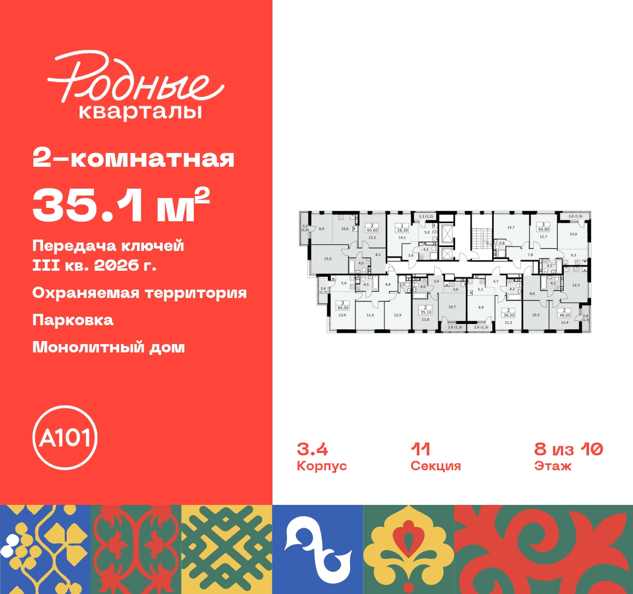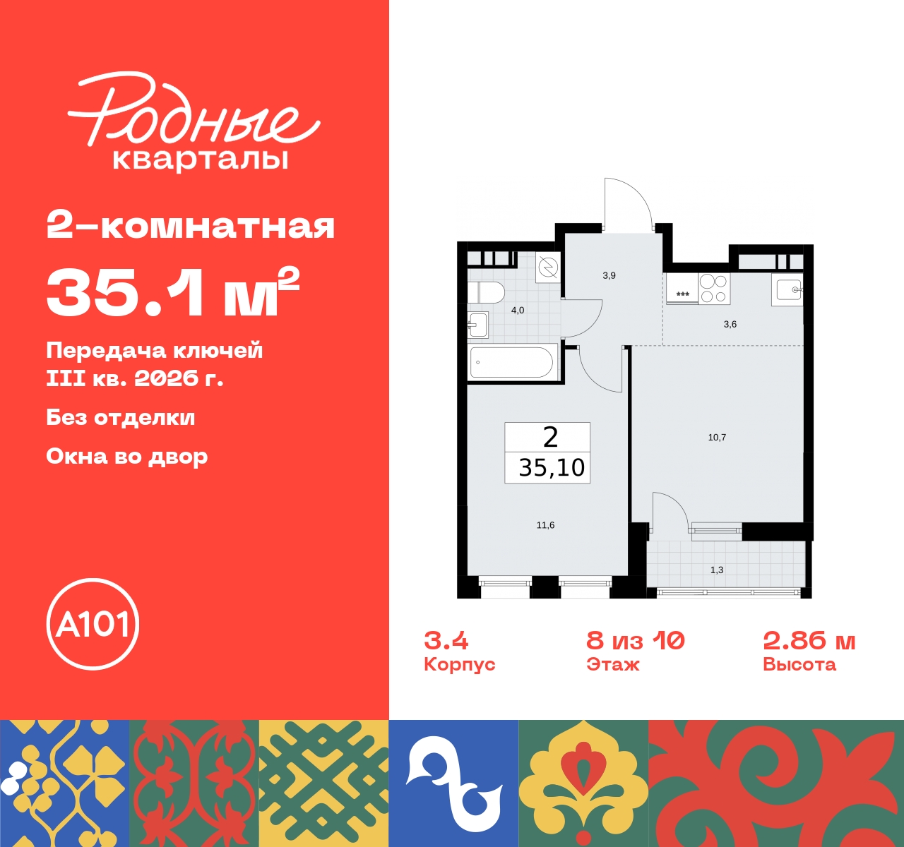 Продается двухкомнатная квартира с европланировкой в ЖК "Родные кварталы" на 8 этаже. Квартира без отделки, новый собственник может сделать ремонт по своему проекту. Общая площадь: 35.1 кв.м., жилая: 22.3 кв.м., общая площадь гостиной-столовой с кухонной зоной: 14.3 кв.м. Европейская планировка, в просторной кухне-гостиной удобно как готовить, так и отдыхать. Комнаты изолированные, все окна выходят на одну сторону. В квартире одна лоджия, один совмещенный санузел. Высота потолков 2.95 м. Квартира находится в корпусе 3.4. Дом монолитный, одноподъездный, высотой 10 этажей. На этаже 7 квартир. В подъезде 1 пассажирский и 1 грузовой лифт. Начало строительства - 2 квартал 2024 года. Окончание строительства - 3 квартал 2026 года. Оформление сделки по договору долевого участия. Артикул квартиры по базе застройщика 96К-3.4-517. Новый жилой комплекс "Родные кварталы" строится в уютной, экологически благополучной локации на юго-западе столицы. В ближайшем окружении – ухоженные малоэтажные посёлки и живописный Ульяновский лесопарк. Благодаря этому из окон откроются вдохновляющие виды, которые не исчезнут со временем за фасадами многоэтажек. Через весь район пройдёт главный бульвар, который свяжет набережную, жилые кварталы и площади в единое дружелюбное пространство, органично наполненное узнаваемыми элементами культурных традиций разных народов. В жилом комплексе создаются условия для комфортного отдыха и занятий спортом всех жителей. Здесь можно прогуляться и отдохнуть в лесопарке на берегу ручья, позаниматься на тренажёрах под открытым небом и спортивных площадках. Для малышей построят игровые комплексы, развивающие силу, координацию и ловкость. Всего в жилом комплексе будет оборудовано 6 га территории для спокойного отдыха и около 9 га — для активного. Подъезды в домах освещены в любое время суток, входы и вестибюль хорошо просматриваются с улицы. Витражное остекление обеспечивает приток естественного света днём, а вечером зажигаются светильники. В отделке домов используется сочетание вентилируемого фасада с облицовкой из фибробетонной плитки и штукатуркой. Комфортная высота домов соразмерна человеку и в среднем составляет 10 этажей. Все дома обеспечены собственными подземными паркингами. В них размещаются машино-места и кладовые. В паркинг или кладовую можно спуститься на лифте или по лестнице. В комплексе появятся бытовые сервисы, магазины, аптеки и другие торгово-бытовые объекты. В жилом районе «Родные кварталы» будут построены: - образовательный центр: школа на 1300 учеников и детский сад на 250 малышей, - два детских сада на 200 мест каждый (один из них сдаётся в 1-й очереди). В транспортной доступности уже работают: - школа № 41 и детский сад — по Боровскому шоссе, - школа № 2057 и детский сад — на запад от района, в дер. Марушкино. ЖК «Родные кварталы» строится в Новомосковском округе столицы, в 15 минутах на автомобиле от аэропорта «Внуково». Район обеспечен удобными выездами на три крупные современные автотрассы. Здесь уже работает и активно развивается система наземного общественного транспорта, включая междугородние рейсы. Интенсивное развитие локации обеспечивают две действующие станции крупных транспортных линий: метро (станция «Внуково») и МЦД (станция «Толстопальцево»). (AQID02378686)