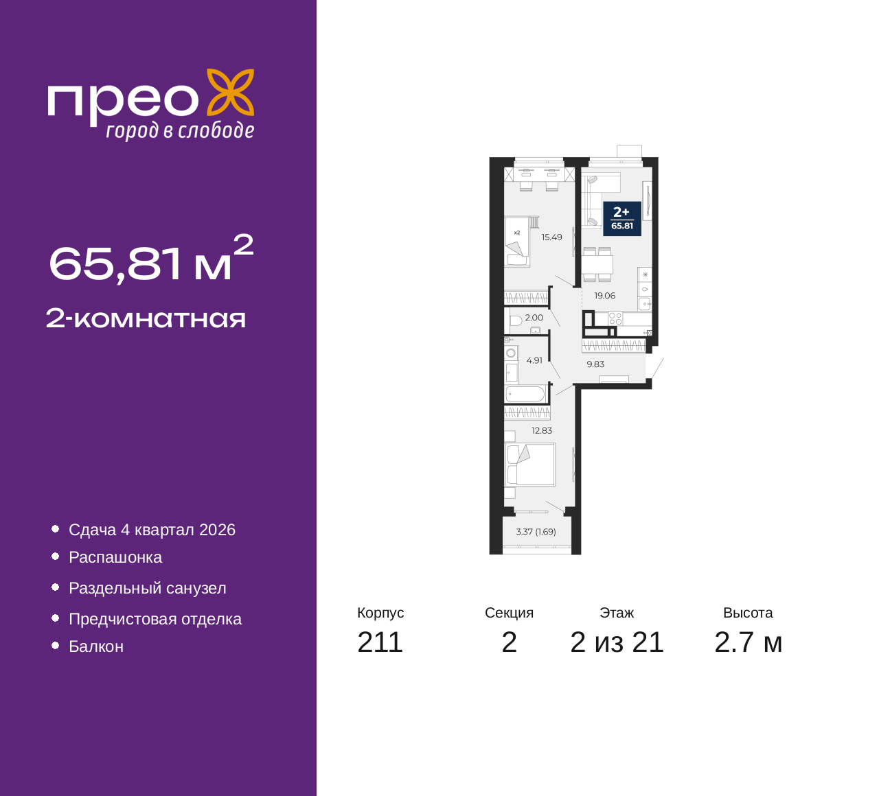 2-комн. квартира от застройщика с предчистовой отделкой в ЖК "Прео" на 2 этаже. Общая площадь: 65.81 кв.м., жилая: 28.32 кв.м., площадь просторной кухни-столовой: 19.06 кв.м. Квартира - распашонка, без проходных комнат, окна выходят на paзные стороны дома. В квартире один балкон, один раздельный санузел. Высота потолков 2.7 м. Дом монолитный, черырехподъездный, переменной этажности, от 14 до 21 этажей. Квартира находится во 2-й секции высотой 21 этаж в корпусе 211. На этаже 10 квартир. В подъезде 1 пассажирский и 1 грузовой лифт. Окончание строительства - 4 квартал 2026 года. Оформление сделки по договору долевого участия. Преображенский — один из самых привлекательных районов для жизни! Это полностью самостоятельный жилой район с точки зрения инфраструктуры. Преображенский находится между Московским и Червишевским трактами в квартале улиц Закалужская — Вьюжная — Александра Протозанова. Не нужно ждать, когда появится инфраструктура — переезжайте на всё готовое. Вблизи расположены действующие школа и детский сад. В этом году откроется еще один сад, а в следующем году — школа. По соседству с Преображенским запланировано строительство городского парка «Комарово» площадью 38 гектар. За 10 минут можно доехать на автомобиле до крупных ТРЦ: «Лента», «Кристалл», «Леруа Мерлен», «Метро» и «Ашан». С 2018 года в районе открыт Соседский центр — пространство, созданное для формирования добрососедской среды, совместного досуга, общения и реализации соседских инициатив. Здесь проходят встречи соседей, а также сами жители района организовывают мероприятия. Организатором такого события может стать любой желающий. В квартирах выполнена качественная предчистовая отделка. Гладкие стены с финишным выравниванием по маякам. Ровный потолок для установки натяжного потолка. Установлены пятикамерные окна с двойным стеклопакетом (3 стекла). Дизайнерские холлы с видеонаблюдением, безбарьерным и прозрачным входом – всегда светло и спокойно. На первом этаже есть просторные колясочные, где все жители могут оставлять свои коляски и велосипеды. В Преображенском есть всё, что нужно для активного отдыха и занятий спортом. Мы сделали большое футбольное поле с безопасным покрытием. Также установили хоккейный корт, который оборудован по всем необходимым стандартам. Во дворах можно делать упражнения на специальных площадках с турниками. Весь район мы обустроили велодорожками, которые связаны в единый маршрут. У нас есть сухие фонтаны, бьющие из земли, деревья, веревки, сетки, скалодром, газон, песок и резинка — осталось просто дать своему ребенку право на свободную игру. По-настоящему хорошие дворы — это те, которые дети предпочитают соцсетям и телевизору. Аккредитация в банках: ПАО «Газпромбанк», ПАО «Банк Уралсиб», ПАО Банк «ВТБ», ОАО «Альфа-Банк», «Сбербанк России» и других. (AQID02427687)