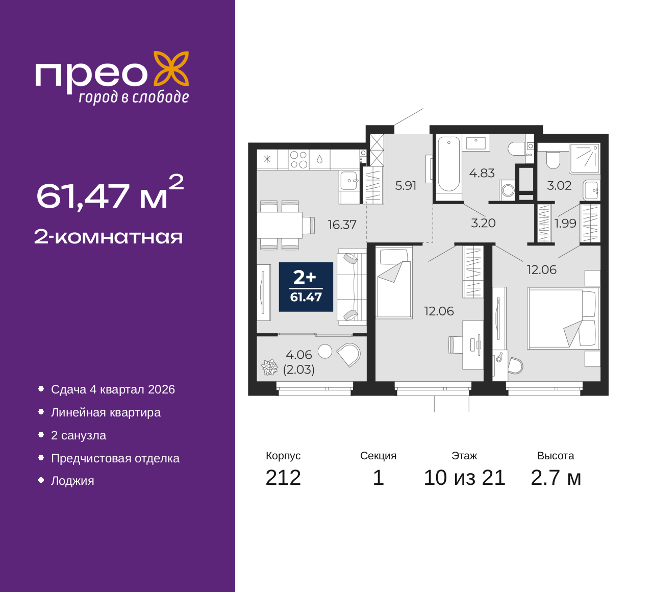 2-комн. квартира от застройщика с предчистовой отделкой в ЖК "Прео" на 10 этаже. Общая площадь: 61.47 кв.м., жилая: 24.12 кв.м., площадь просторной кухни-столовой: 16.37 кв.м. Комнаты изолированные, все окна выходят на одну сторону. В квартире одна лоджия, два совмещенных санузла. Высота потолков 2.7 м. Квартира находится в корпусе 212. Дом монолитный, одноподъездный, высотой 21 этаж. На этаже 8 квартир. В подъезде 2 пассажирских и 1 грузовой лифт. Окончание строительства - 4 квартал 2026 года. Оформление сделки по договору долевого участия. Преображенский — один из самых привлекательных районов для жизни! Это полностью самостоятельный жилой район с точки зрения инфраструктуры. Преображенский находится между Московским и Червишевским трактами в квартале улиц Закалужская — Вьюжная — Александра Протозанова. Не нужно ждать, когда появится инфраструктура — переезжайте на всё готовое. Вблизи расположены действующие школа и детский сад. В этом году откроется еще один сад, а в следующем году — школа. По соседству с Преображенским запланировано строительство городского парка «Комарово» площадью 38 гектар. За 10 минут можно доехать на автомобиле до крупных ТРЦ: «Лента», «Кристалл», «Леруа Мерлен», «Метро» и «Ашан». С 2018 года в районе открыт Соседский центр — пространство, созданное для формирования добрососедской среды, совместного досуга, общения и реализации соседских инициатив. Здесь проходят встречи соседей, а также сами жители района организовывают мероприятия. Организатором такого события может стать любой желающий. В квартирах выполнена качественная предчистовая отделка. Гладкие стены с финишным выравниванием по маякам. Ровный потолок для установки натяжного потолка. Установлены пятикамерные окна с двойным стеклопакетом (3 стекла). Дизайнерские холлы с видеонаблюдением, безбарьерным и прозрачным входом – всегда светло и спокойно. На первом этаже есть просторные колясочные, где все жители могут оставлять свои коляски и велосипеды. В Преображенском есть всё, что нужно для активного отдыха и занятий спортом. Мы сделали большое футбольное поле с безопасным покрытием. Также установили хоккейный корт, который оборудован по всем необходимым стандартам. Во дворах можно делать упражнения на специальных площадках с турниками. Весь район мы обустроили велодорожками, которые связаны в единый маршрут. У нас есть сухие фонтаны, бьющие из земли, деревья, веревки, сетки, скалодром, газон, песок и резинка — осталось просто дать своему ребенку право на свободную игру. По-настоящему хорошие дворы — это те, которые дети предпочитают соцсетям и телевизору. Аккредитация в банках: ПАО «Банк Уралсиб», «Сбербанк России», ПАО «Газпромбанк», ОАО «Альфа-Банк», ПАО Банк «ВТБ» и других. (AQID02427652)