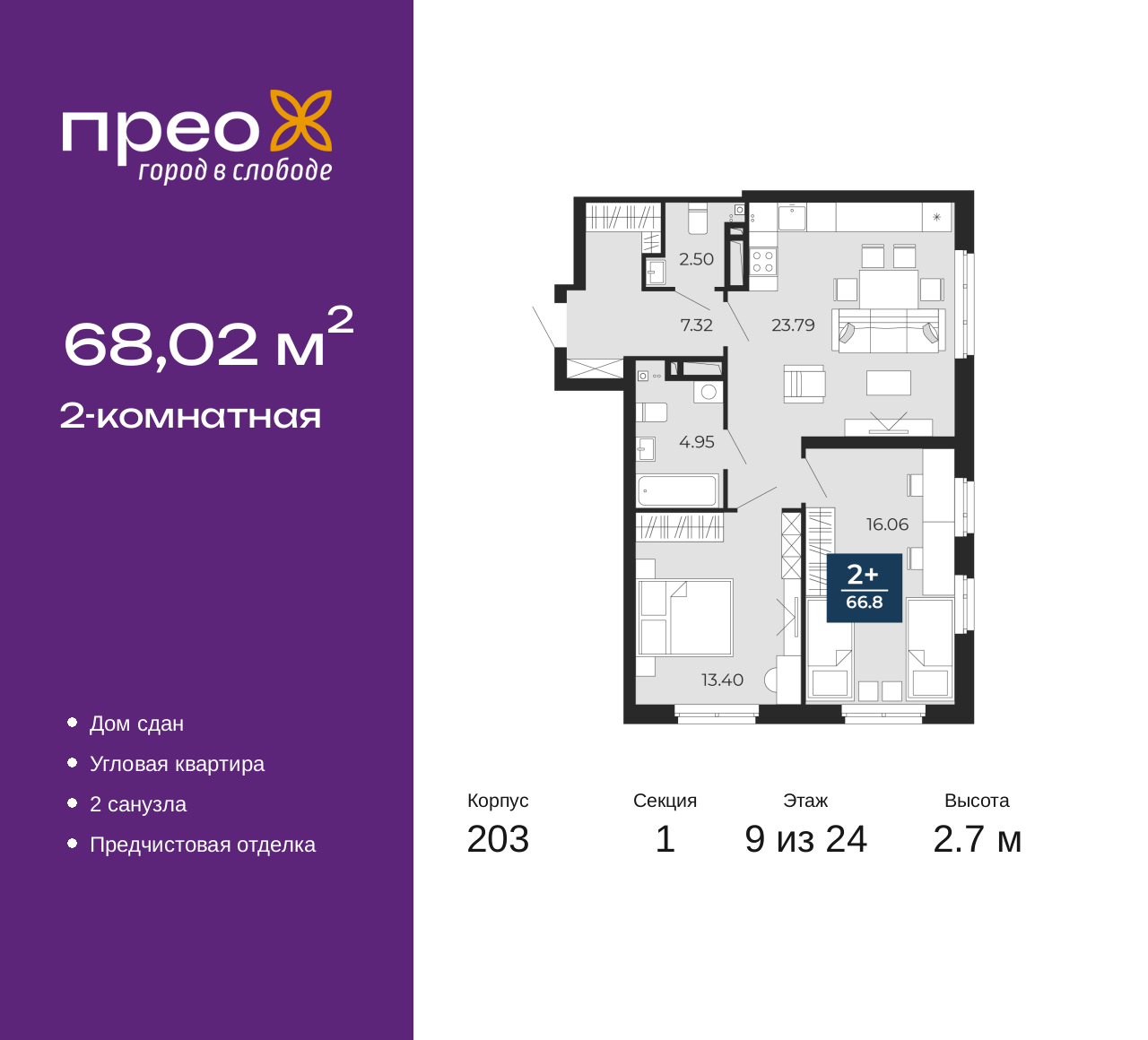 Просторная двухкомнатная квартира с предчистовой отделкой в ЖК "Прео" на 9 этаже. Общая площадь: 68.02 кв.м., жилая: 29.46 кв.м., площадь просторной кухни-столовой: 23.79 кв.м. Квартира угловая, окна oбecпeчивaют paвнoмepнoe ocвeщeниe в тeчeниe дня. В квартире один совмещенный и один раздельный санузел. Высота потолков 2.7 м. Квартира находится в корпусе 203. Дом монолитный, одноподъездный, высотой 24 этажа. На этаже 14 квартир. В подъезде 2 грузовых лифта. В настоящее время строительство окончено, дом сдан в 4 квартале 2024 года. Оформление сделки по договору купли-продажи. Преображенский — один из самых привлекательных районов для жизни! Это полностью самостоятельный жилой район с точки зрения инфраструктуры. Преображенский находится между Московским и Червишевским трактами в квартале улиц Закалужская — Вьюжная — Александра Протозанова. Не нужно ждать, когда появится инфраструктура — переезжайте на всё готовое. Вблизи расположены действующие школа и детский сад. В этом году откроется еще один сад, а в следующем году — школа. По соседству с Преображенским запланировано строительство городского парка «Комарово» площадью 38 гектар. За 10 минут можно доехать на автомобиле до крупных ТРЦ: «Лента», «Кристалл», «Леруа Мерлен», «Метро» и «Ашан». С 2018 года в районе открыт Соседский центр — пространство, созданное для формирования добрососедской среды, совместного досуга, общения и реализации соседских инициатив. Здесь проходят встречи соседей, а также сами жители района организовывают мероприятия. Организатором такого события может стать любой желающий. В квартирах выполнена качественная предчистовая отделка. Гладкие стены с финишным выравниванием по маякам. Ровный потолок для установки натяжного потолка. Установлены пятикамерные окна с двойным стеклопакетом (3 стекла). Дизайнерские холлы с видеонаблюдением, безбарьерным и прозрачным входом – всегда светло и спокойно. На первом этаже есть просторные колясочные, где все жители могут оставлять свои коляски и велосипеды. В Преображенском есть всё, что нужно для активного отдыха и занятий спортом. Мы сделали большое футбольное поле с безопасным покрытием. Также установили хоккейный корт, который оборудован по всем необходимым стандартам. Во дворах можно делать упражнения на специальных площадках с турниками. Весь район мы обустроили велодорожками, которые связаны в единый маршрут. У нас есть сухие фонтаны, бьющие из земли, деревья, веревки, сетки, скалодром, газон, песок и резинка — осталось просто дать своему ребенку право на свободную игру. По-настоящему хорошие дворы — это те, которые дети предпочитают соцсетям и телевизору. Аккредитация в банках: «Сбербанк России», ПАО Банк «ВТБ», ПАО «Банк Уралсиб», ПАО «Газпромбанк», ОАО «Альфа-Банк» и других. (AQID02353809)