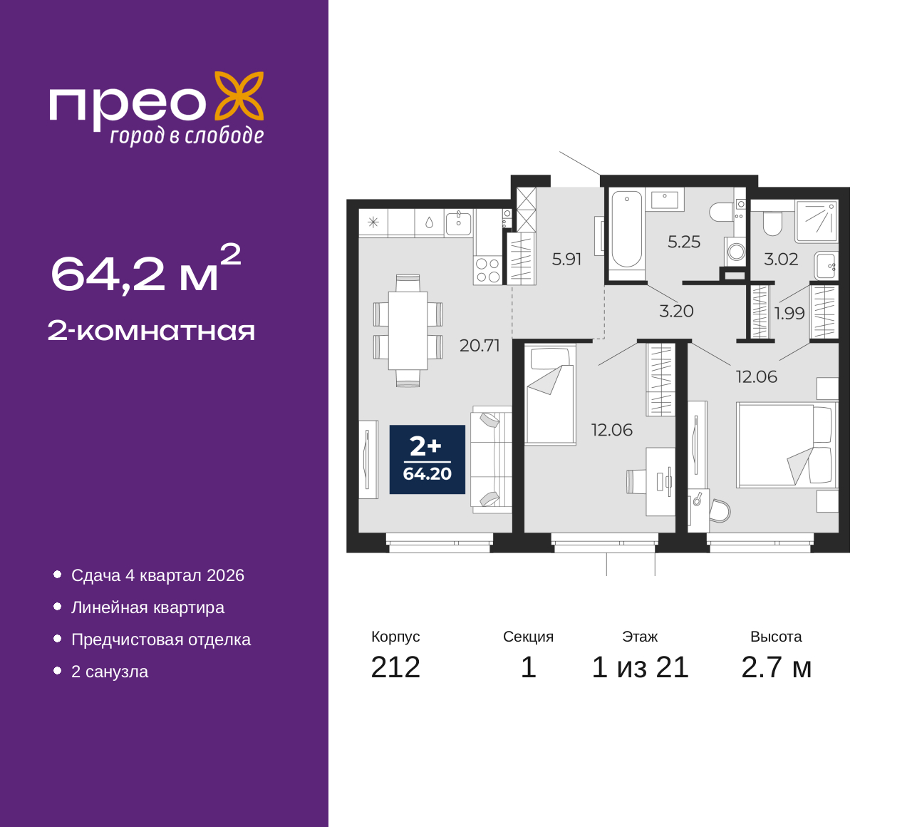 Продается двухкомнатная квартира с предчистовой отделкой в ЖК "Прео" на 1 этаже. Общая площадь: 64.2 кв.м., жилая: 24.12 кв.м., площадь просторной кухни-столовой: 20.71 кв.м. Комнаты изолированные, все окна выходят на одну сторону. В квартире два совмещенных санузла. Высота потолков 2.7 м. Квартира находится в корпусе 212. Дом монолитный, одноподъездный, высотой 21 этаж. На этаже 8 квартир. В подъезде 2 пассажирских и 1 грузовой лифт. Окончание строительства - 4 квартал 2026 года. Оформление сделки по договору долевого участия. Преображенский — один из самых привлекательных районов для жизни! Это полностью самостоятельный жилой район с точки зрения инфраструктуры. Преображенский находится между Московским и Червишевским трактами в квартале улиц Закалужская — Вьюжная — Александра Протозанова. Не нужно ждать, когда появится инфраструктура — переезжайте на всё готовое. Вблизи расположены действующие школа и детский сад. В этом году откроется еще один сад, а в следующем году — школа. По соседству с Преображенским запланировано строительство городского парка «Комарово» площадью 38 гектар. За 10 минут можно доехать на автомобиле до крупных ТРЦ: «Лента», «Кристалл», «Леруа Мерлен», «Метро» и «Ашан». С 2018 года в районе открыт Соседский центр — пространство, созданное для формирования добрососедской среды, совместного досуга, общения и реализации соседских инициатив. Здесь проходят встречи соседей, а также сами жители района организовывают мероприятия. Организатором такого события может стать любой желающий. В квартирах выполнена качественная предчистовая отделка. Гладкие стены с финишным выравниванием по маякам. Ровный потолок для установки натяжного потолка. Установлены пятикамерные окна с двойным стеклопакетом (3 стекла). Дизайнерские холлы с видеонаблюдением, безбарьерным и прозрачным входом – всегда светло и спокойно. На первом этаже есть просторные колясочные, где все жители могут оставлять свои коляски и велосипеды. В Преображенском есть всё, что нужно для активного отдыха и занятий спортом. Мы сделали большое футбольное поле с безопасным покрытием. Также установили хоккейный корт, который оборудован по всем необходимым стандартам. Во дворах можно делать упражнения на специальных площадках с турниками. Весь район мы обустроили велодорожками, которые связаны в единый маршрут. У нас есть сухие фонтаны, бьющие из земли, деревья, веревки, сетки, скалодром, газон, песок и резинка — осталось просто дать своему ребенку право на свободную игру. По-настоящему хорошие дворы — это те, которые дети предпочитают соцсетям и телевизору. Аккредитация в банках: ПАО «Газпромбанк», ПАО Банк «ВТБ», ПАО «Банк Уралсиб», «Сбербанк России», ОАО «Альфа-Банк» и других. (AQID02427653)
