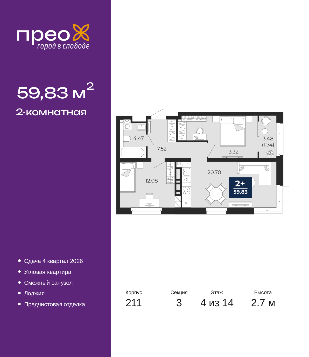 Продается 2-комн. квартира с предчистовой отделкой в ЖК "Прео" на 4 этаже. Общая площадь: 59.83 кв.м., жилая: 25.4 кв.м., площадь просторной кухни-столовой: 20.7 кв.м. Угловая квартира, окна oбecпeчивaют paвнoмepнoe ocвeщeниe в тeчeниe дня. В квартире одна лоджия, один совмещенный санузел. Высота потолков 2.7 м. Дом монолитный, черырехподъездный, переменной этажности, от 14 до 21 этажей. Квартира находится в 3-й секции высотой 14 этажей в корпусе 211. На этаже 6 квартир. В подъезде 1 пассажирский и 1 грузовой лифт. Окончание строительства - 4 квартал 2026 года. Оформление сделки по договору долевого участия. Преображенский — один из самых привлекательных районов для жизни! Это полностью самостоятельный жилой район с точки зрения инфраструктуры. Преображенский находится между Московским и Червишевским трактами в квартале улиц Закалужская — Вьюжная — Александра Протозанова. Не нужно ждать, когда появится инфраструктура — переезжайте на всё готовое. Вблизи расположены действующие школа и детский сад. В этом году откроется еще один сад, а в следующем году — школа. По соседству с Преображенским запланировано строительство городского парка «Комарово» площадью 38 гектар. За 10 минут можно доехать на автомобиле до крупных ТРЦ: «Лента», «Кристалл», «Леруа Мерлен», «Метро» и «Ашан». С 2018 года в районе открыт Соседский центр — пространство, созданное для формирования добрососедской среды, совместного досуга, общения и реализации соседских инициатив. Здесь проходят встречи соседей, а также сами жители района организовывают мероприятия. Организатором такого события может стать любой желающий. В квартирах выполнена качественная предчистовая отделка. Гладкие стены с финишным выравниванием по маякам. Ровный потолок для установки натяжного потолка. Установлены пятикамерные окна с двойным стеклопакетом (3 стекла). Дизайнерские холлы с видеонаблюдением, безбарьерным и прозрачным входом – всегда светло и спокойно. На первом этаже есть просторные колясочные, где все жители могут оставлять свои коляски и велосипеды. В Преображенском есть всё, что нужно для активного отдыха и занятий спортом. Мы сделали большое футбольное поле с безопасным покрытием. Также установили хоккейный корт, который оборудован по всем необходимым стандартам. Во дворах можно делать упражнения на специальных площадках с турниками. Весь район мы обустроили велодорожками, которые связаны в единый маршрут. У нас есть сухие фонтаны, бьющие из земли, деревья, веревки, сетки, скалодром, газон, песок и резинка — осталось просто дать своему ребенку право на свободную игру. По-настоящему хорошие дворы — это те, которые дети предпочитают соцсетям и телевизору. Аккредитация в банках: ОАО «Альфа-Банк», ПАО «Газпромбанк», ПАО Банк «ВТБ», «Сбербанк России», ПАО «Банк Уралсиб» и других. (AQID02427660)