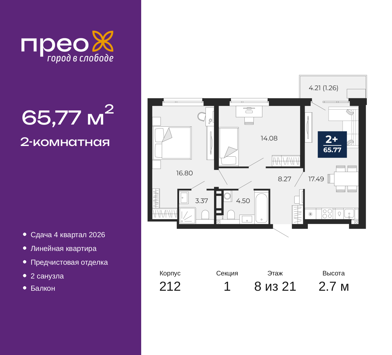 Продается 2-комн. квартира от застройщика с предчистовой отделкой в ЖК "Прео" на 8 этаже. Общая площадь: 65.77 кв.м., жилая: 30.88 кв.м., площадь просторной кухни-столовой: 17.49 кв.м. Комнаты изолированные, все окна выходят на одну сторону. В квартире один балкон, два совмещенных санузла. Высота потолков 2.7 м. Квартира находится в корпусе 212. Дом монолитный, одноподъездный, высотой 21 этаж. На этаже 8 квартир. В подъезде 2 пассажирских и 1 грузовой лифт. Окончание строительства - 4 квартал 2026 года. Оформление сделки по договору долевого участия. Преображенский — один из самых привлекательных районов для жизни! Это полностью самостоятельный жилой район с точки зрения инфраструктуры. Преображенский находится между Московским и Червишевским трактами в квартале улиц Закалужская — Вьюжная — Александра Протозанова. Не нужно ждать, когда появится инфраструктура — переезжайте на всё готовое. Вблизи расположены действующие школа и детский сад. В этом году откроется еще один сад, а в следующем году — школа. По соседству с Преображенским запланировано строительство городского парка «Комарово» площадью 38 гектар. За 10 минут можно доехать на автомобиле до крупных ТРЦ: «Лента», «Кристалл», «Леруа Мерлен», «Метро» и «Ашан». С 2018 года в районе открыт Соседский центр — пространство, созданное для формирования добрососедской среды, совместного досуга, общения и реализации соседских инициатив. Здесь проходят встречи соседей, а также сами жители района организовывают мероприятия. Организатором такого события может стать любой желающий. В квартирах выполнена качественная предчистовая отделка. Гладкие стены с финишным выравниванием по маякам. Ровный потолок для установки натяжного потолка. Установлены пятикамерные окна с двойным стеклопакетом (3 стекла). Дизайнерские холлы с видеонаблюдением, безбарьерным и прозрачным входом – всегда светло и спокойно. На первом этаже есть просторные колясочные, где все жители могут оставлять свои коляски и велосипеды. В Преображенском есть всё, что нужно для активного отдыха и занятий спортом. Мы сделали большое футбольное поле с безопасным покрытием. Также установили хоккейный корт, который оборудован по всем необходимым стандартам. Во дворах можно делать упражнения на специальных площадках с турниками. Весь район мы обустроили велодорожками, которые связаны в единый маршрут. У нас есть сухие фонтаны, бьющие из земли, деревья, веревки, сетки, скалодром, газон, песок и резинка — осталось просто дать своему ребенку право на свободную игру. По-настоящему хорошие дворы — это те, которые дети предпочитают соцсетям и телевизору. Аккредитация в банках: ПАО «Банк Уралсиб», ПАО Банк «ВТБ», «Сбербанк России», ПАО «Газпромбанк», ОАО «Альфа-Банк» и других. (AQID02427702)