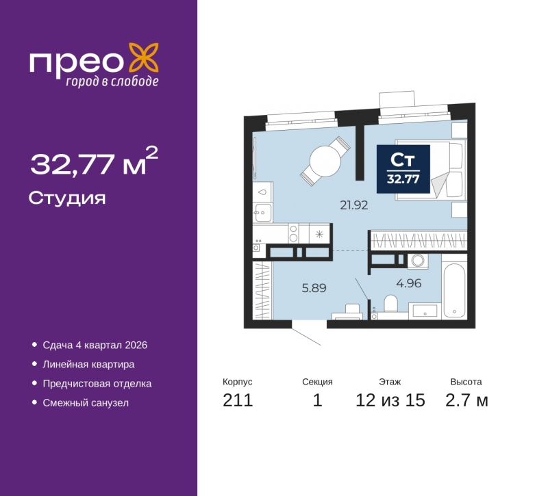 Продается однокомнатная квартира-студия от застройщика с предчистовой отделкой в ЖК "Прео" на 12 этаже. Общая площадь: 32.77 кв.м., площадь гостиной 21.92 кв.м., из которых 10 кв.м. выделено под кухонную зону. Все окна выходят на одну сторону. В квартире один совмещенный санузел. Высота потолков 2.7 м. Дом монолитный, черырехподъездный, переменной этажности, от 14 до 21 этажей. Квартира находится в 1-й секции высотой 21 этаж в корпусе 211. На этаже 8 квартир. В подъезде 1 пассажирский и 1 грузовой лифт. Окончание строительства - 4 квартал 2026 года. Оформление сделки по договору долевого участия. Преображенский — один из самых привлекательных районов для жизни! Это полностью самостоятельный жилой район с точки зрения инфраструктуры. Преображенский находится между Московским и Червишевским трактами в квартале улиц Закалужская — Вьюжная — Александра Протозанова. Не нужно ждать, когда появится инфраструктура — переезжайте на всё готовое. Вблизи расположены действующие школа и детский сад. В этом году откроется еще один сад, а в следующем году — школа. По соседству с Преображенским запланировано строительство городского парка «Комарово» площадью 38 гектар. За 10 минут можно доехать на автомобиле до крупных ТРЦ: «Лента», «Кристалл», «Леруа Мерлен», «Метро» и «Ашан». С 2018 года в районе открыт Соседский центр — пространство, созданное для формирования добрососедской среды, совместного досуга, общения и реализации соседских инициатив. Здесь проходят встречи соседей, а также сами жители района организовывают мероприятия. Организатором такого события может стать любой желающий. В квартирах выполнена качественная предчистовая отделка. Гладкие стены с финишным выравниванием по маякам. Ровный потолок для установки натяжного потолка. Установлены пятикамерные окна с двойным стеклопакетом (3 стекла). Дизайнерские холлы с видеонаблюдением, безбарьерным и прозрачным входом – всегда светло и спокойно. На первом этаже есть просторные колясочные, где все жители могут оставлять свои коляски и велосипеды. В Преображенском есть всё, что нужно для активного отдыха и занятий спортом. Мы сделали большое футбольное поле с безопасным покрытием. Также установили хоккейный корт, который оборудован по всем необходимым стандартам. Во дворах можно делать упражнения на специальных площадках с турниками. Весь район мы обустроили велодорожками, которые связаны в единый маршрут. У нас есть сухие фонтаны, бьющие из земли, деревья, веревки, сетки, скалодром, газон, песок и резинка — осталось просто дать своему ребенку право на свободную игру. По-настоящему хорошие дворы — это те, которые дети предпочитают соцсетям и телевизору. Аккредитация в банках: ОАО «Альфа-Банк», ПАО Банк «ВТБ», «Сбербанк России», ПАО «Газпромбанк», ПАО «Банк Уралсиб» и других. (AQID02427467)