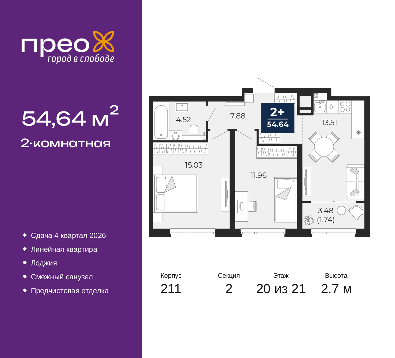 2-комн. квартира с предчистовой отделкой в ЖК "Прео" на 20 этаже. Общая площадь: 54.64 кв.м., жилая: 26.99 кв.м., площадь просторной кухни-столовой: 13.51 кв.м. Комнаты изолированные, все окна выходят на одну сторону. В квартире одна лоджия, один совмещенный санузел. Высота потолков 2.7 м. Дом монолитный, черырехподъездный, переменной этажности, от 14 до 21 этажей. Квартира находится во 2-й секции высотой 21 этаж в корпусе 211. На этаже 10 квартир. В подъезде 1 пассажирский и 1 грузовой лифт. Окончание строительства - 4 квартал 2026 года. Оформление сделки по договору долевого участия. Преображенский — один из самых привлекательных районов для жизни! Это полностью самостоятельный жилой район с точки зрения инфраструктуры. Преображенский находится между Московским и Червишевским трактами в квартале улиц Закалужская — Вьюжная — Александра Протозанова. Не нужно ждать, когда появится инфраструктура — переезжайте на всё готовое. Вблизи расположены действующие школа и детский сад. В этом году откроется еще один сад, а в следующем году — школа. По соседству с Преображенским запланировано строительство городского парка «Комарово» площадью 38 гектар. За 10 минут можно доехать на автомобиле до крупных ТРЦ: «Лента», «Кристалл», «Леруа Мерлен», «Метро» и «Ашан». С 2018 года в районе открыт Соседский центр — пространство, созданное для формирования добрососедской среды, совместного досуга, общения и реализации соседских инициатив. Здесь проходят встречи соседей, а также сами жители района организовывают мероприятия. Организатором такого события может стать любой желающий. В квартирах выполнена качественная предчистовая отделка. Гладкие стены с финишным выравниванием по маякам. Ровный потолок для установки натяжного потолка. Установлены пятикамерные окна с двойным стеклопакетом (3 стекла). Дизайнерские холлы с видеонаблюдением, безбарьерным и прозрачным входом – всегда светло и спокойно. На первом этаже есть просторные колясочные, где все жители могут оставлять свои коляски и велосипеды. В Преображенском есть всё, что нужно для активного отдыха и занятий спортом. Мы сделали большое футбольное поле с безопасным покрытием. Также установили хоккейный корт, который оборудован по всем необходимым стандартам. Во дворах можно делать упражнения на специальных площадках с турниками. Весь район мы обустроили велодорожками, которые связаны в единый маршрут. У нас есть сухие фонтаны, бьющие из земли, деревья, веревки, сетки, скалодром, газон, песок и резинка — осталось просто дать своему ребенку право на свободную игру. По-настоящему хорошие дворы — это те, которые дети предпочитают соцсетям и телевизору. Аккредитация в банках: «Сбербанк России», ПАО Банк «ВТБ», ОАО «Альфа-Банк», ПАО «Газпромбанк», ПАО «Банк Уралсиб» и других. (AQID02427594)