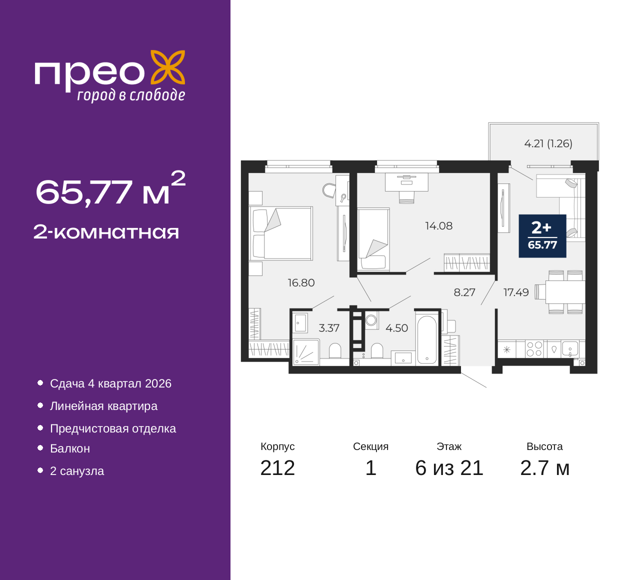 Продается двухкомнатная квартира от застройщика с предчистовой отделкой в ЖК "Прео" на 6 этаже. Общая площадь: 65.77 кв.м., жилая: 30.88 кв.м., площадь просторной кухни-столовой: 17.49 кв.м. Комнаты изолированные, все окна выходят на одну сторону. В квартире один балкон, два совмещенных санузла. Высота потолков 2.7 м. Квартира находится в корпусе 212. Дом монолитный, одноподъездный, высотой 21 этаж. На этаже 8 квартир. В подъезде 2 пассажирских и 1 грузовой лифт. Окончание строительства - 4 квартал 2026 года. Оформление сделки по договору долевого участия. Преображенский — один из самых привлекательных районов для жизни! Это полностью самостоятельный жилой район с точки зрения инфраструктуры. Преображенский находится между Московским и Червишевским трактами в квартале улиц Закалужская — Вьюжная — Александра Протозанова. Не нужно ждать, когда появится инфраструктура — переезжайте на всё готовое. Вблизи расположены действующие школа и детский сад. В этом году откроется еще один сад, а в следующем году — школа. По соседству с Преображенским запланировано строительство городского парка «Комарово» площадью 38 гектар. За 10 минут можно доехать на автомобиле до крупных ТРЦ: «Лента», «Кристалл», «Леруа Мерлен», «Метро» и «Ашан». С 2018 года в районе открыт Соседский центр — пространство, созданное для формирования добрососедской среды, совместного досуга, общения и реализации соседских инициатив. Здесь проходят встречи соседей, а также сами жители района организовывают мероприятия. Организатором такого события может стать любой желающий. В квартирах выполнена качественная предчистовая отделка. Гладкие стены с финишным выравниванием по маякам. Ровный потолок для установки натяжного потолка. Установлены пятикамерные окна с двойным стеклопакетом (3 стекла). Дизайнерские холлы с видеонаблюдением, безбарьерным и прозрачным входом – всегда светло и спокойно. На первом этаже есть просторные колясочные, где все жители могут оставлять свои коляски и велосипеды. В Преображенском есть всё, что нужно для активного отдыха и занятий спортом. Мы сделали большое футбольное поле с безопасным покрытием. Также установили хоккейный корт, который оборудован по всем необходимым стандартам. Во дворах можно делать упражнения на специальных площадках с турниками. Весь район мы обустроили велодорожками, которые связаны в единый маршрут. У нас есть сухие фонтаны, бьющие из земли, деревья, веревки, сетки, скалодром, газон, песок и резинка — осталось просто дать своему ребенку право на свободную игру. По-настоящему хорошие дворы — это те, которые дети предпочитают соцсетям и телевизору. Аккредитация в банках: ПАО «Газпромбанк», ПАО «Банк Уралсиб», ПАО Банк «ВТБ», «Сбербанк России», ОАО «Альфа-Банк» и других. (AQID02427706)