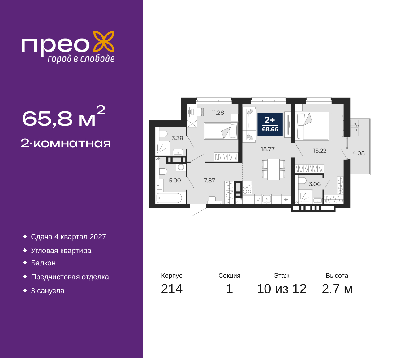 Продается 2-комн. квартира от застройщика с предчистовой отделкой в ЖК "Прео" на 10 этаже. Общая площадь: 65.8 кв.м., жилая: 26.5 кв.м., площадь просторной кухни-столовой: 18.77 кв.м. Квартира угловая, идеально подойдет любителям тишины и панорамных видов. В квартире один балкон, три совмещенных санузла. Высота потолков 2.7 м. Дом монолитный, двухподъездный, переменной этажности, от 12 до 20 этажей. Квартира находится в 1-й секции высотой 12 этажей в корпусе 214. На этаже 8 квартир. В подъезде 1 пассажирский и 1 грузовой лифт. Окончание строительства - 4 квартал 2027 года. Оформление сделки по договору долевого участия. Преображенский — один из самых привлекательных районов для жизни! Это полностью самостоятельный жилой район с точки зрения инфраструктуры. Преображенский находится между Московским и Червишевским трактами в квартале улиц Закалужская — Вьюжная — Александра Протозанова. Не нужно ждать, когда появится инфраструктура — переезжайте на всё готовое. Вблизи расположены действующие школа и детский сад. В этом году откроется еще один сад, а в следующем году — школа. По соседству с Преображенским запланировано строительство городского парка «Комарово» площадью 38 гектар. За 10 минут можно доехать на автомобиле до крупных ТРЦ: «Лента», «Кристалл», «Леруа Мерлен», «Метро» и «Ашан». С 2018 года в районе открыт Соседский центр — пространство, созданное для формирования добрососедской среды, совместного досуга, общения и реализации соседских инициатив. Здесь проходят встречи соседей, а также сами жители района организовывают мероприятия. Организатором такого события может стать любой желающий. В квартирах выполнена качественная предчистовая отделка. Гладкие стены с финишным выравниванием по маякам. Ровный потолок для установки натяжного потолка. Установлены пятикамерные окна с двойным стеклопакетом (3 стекла). Дизайнерские холлы с видеонаблюдением, безбарьерным и прозрачным входом – всегда светло и спокойно. На первом этаже есть просторные колясочные, где все жители могут оставлять свои коляски и велосипеды. В Преображенском есть всё, что нужно для активного отдыха и занятий спортом. Мы сделали большое футбольное поле с безопасным покрытием. Также установили хоккейный корт, который оборудован по всем необходимым стандартам. Во дворах можно делать упражнения на специальных площадках с турниками. Весь район мы обустроили велодорожками, которые связаны в единый маршрут. У нас есть сухие фонтаны, бьющие из земли, деревья, веревки, сетки, скалодром, газон, песок и резинка — осталось просто дать своему ребенку право на свободную игру. По-настоящему хорошие дворы — это те, которые дети предпочитают соцсетям и телевизору. Аккредитация в банках: ПАО «Газпромбанк», «Сбербанк России», ПАО Банк «ВТБ», ОАО «Альфа-Банк», ПАО «Банк Уралсиб» и других. (AQID02525608)