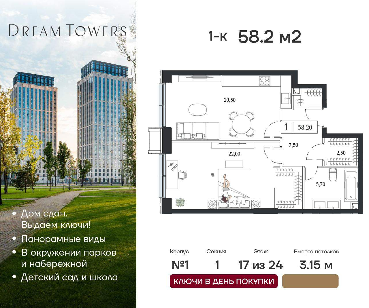 Рассрочка 0% от застройщика. Первоначальный взнос от 20%. Ключи в день покупки. ЖК Dream Towers проект премиум-класса в окружении парков и набережной, с полностью готовой инфраструктурой для комфортной жизни и отдыха. Продаётся 1-квартира на 17 этаже 24-этажного дома (1 корпус) . Общая площадь: 58.2 кв.м. Высота потолков от 3.15 м. Город-курорт на 100 Га в шаге от вашего дома: - пляжный комлекс Dream Beach Club; - парк аттракционов Остров Мечты; - 44 Га ландшафтных парков; - пешеходная набережная; - яхт-клуб; - Южный речной вокзал; - вейк-парк и многое другое. В Dream Towers предусмотрено все для комфортной жизни с семьей: - дизайнерские лобби с общественной гостиной, колясочной и лапомойками; - охраняемый благоустроенной двор только для жителей; - собственный десткий сад и школа прямо во дворе; - красивая архитектура зданий в стиле Ар-деко; - облицовка фасадов из натурального камня с архитектурной подсветкой; - широкоформатное остекление окон в пол для лучших видовых характеристик на парки и пойму Москвы-реки; - подземный паркинг; - клубный формат проживания; - эргономичные планировки от 40 до 162 м2; - высокие потолки от 3,15 до 4,1 м; - квартиры с террасами; - вся необходимая инфраструктура на первых этажах домов, а также в торговой части тематического парка "Остров Мечты" (рестораны, кафе, супермаркет, магазины, салон красоты, йога-студия и многое другое) . Центр рядом: 15 минут до Садового кольца на авто, 20 минут до Сити или Кремля. В 5 минутах прогулочным шагом - станция метро "Технопарк". [#7654180#]