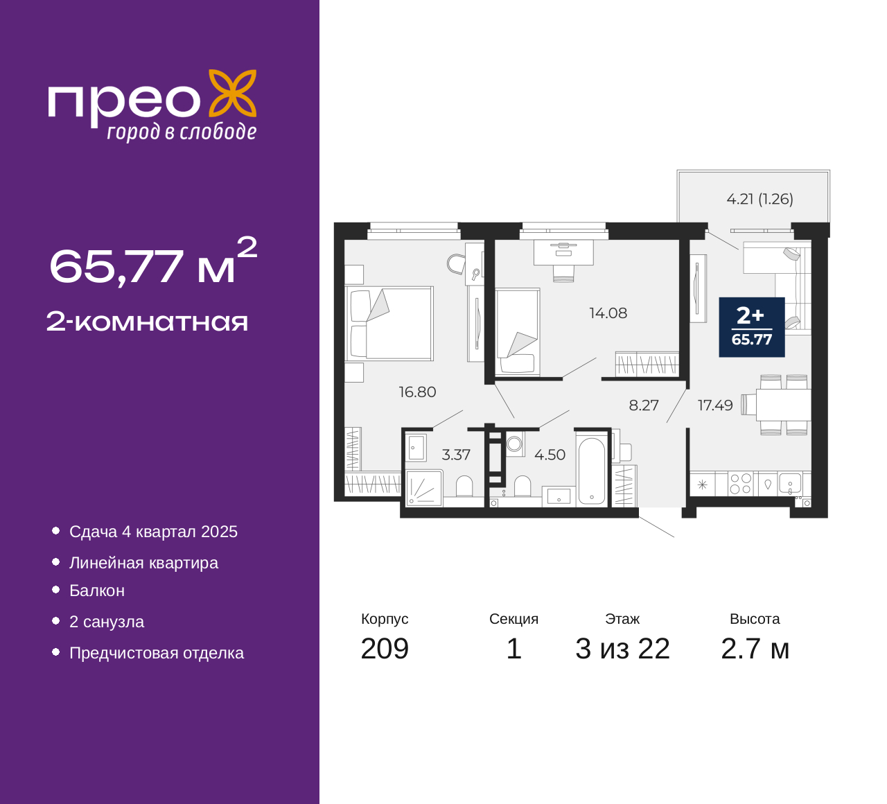 Двухкомнатная квартира с предчистовой отделкой в ЖК "Прео" на 3 этаже. Общая площадь: 65.77 кв.м., жилая: 30.88 кв.м., площадь просторной кухни-столовой: 17.49 кв.м. Комнаты изолированные, все окна выходят на одну сторону. В квартире один балкон, два совмещенных санузла. Высота потолков 2.7 м. Квартира находится в корпусе 209. Дом монолитный, одноподъездный, высотой 22 этажа. На этаже 8 квартир. В подъезде 1 пассажирский и 1 грузовой лифт. Окончание строительства - 4 квартал 2025 года. Оформление сделки по договору долевого участия. Преображенский — один из самых привлекательных районов для жизни! Это полностью самостоятельный жилой район с точки зрения инфраструктуры. Преображенский находится между Московским и Червишевским трактами в квартале улиц Закалужская — Вьюжная — Александра Протозанова. Не нужно ждать, когда появится инфраструктура — переезжайте на всё готовое. Вблизи расположены действующие школа и детский сад. В этом году откроется еще один сад, а в следующем году — школа. По соседству с Преображенским запланировано строительство городского парка «Комарово» площадью 38 гектар. За 10 минут можно доехать на автомобиле до крупных ТРЦ: «Лента», «Кристалл», «Леруа Мерлен», «Метро» и «Ашан». С 2018 года в районе открыт Соседский центр — пространство, созданное для формирования добрососедской среды, совместного досуга, общения и реализации соседских инициатив. Здесь проходят встречи соседей, а также сами жители района организовывают мероприятия. Организатором такого события может стать любой желающий. В квартирах выполнена качественная предчистовая отделка. Гладкие стены с финишным выравниванием по маякам. Ровный потолок для установки натяжного потолка. Установлены пятикамерные окна с двойным стеклопакетом (3 стекла). Дизайнерские холлы с видеонаблюдением, безбарьерным и прозрачным входом – всегда светло и спокойно. На первом этаже есть просторные колясочные, где все жители могут оставлять свои коляски и велосипеды. В Преображенском есть всё, что нужно для активного отдыха и занятий спортом. Мы сделали большое футбольное поле с безопасным покрытием. Также установили хоккейный корт, который оборудован по всем необходимым стандартам. Во дворах можно делать упражнения на специальных площадках с турниками. Весь район мы обустроили велодорожками, которые связаны в единый маршрут. У нас есть сухие фонтаны, бьющие из земли, деревья, веревки, сетки, скалодром, газон, песок и резинка — осталось просто дать своему ребенку право на свободную игру. По-настоящему хорошие дворы — это те, которые дети предпочитают соцсетям и телевизору. Аккредитация в банках: «Сбербанк России», ПАО «Газпромбанк», ПАО «Банк Уралсиб», ОАО «Альфа-Банк», ПАО Банк «ВТБ» и других. (AQID02526913)